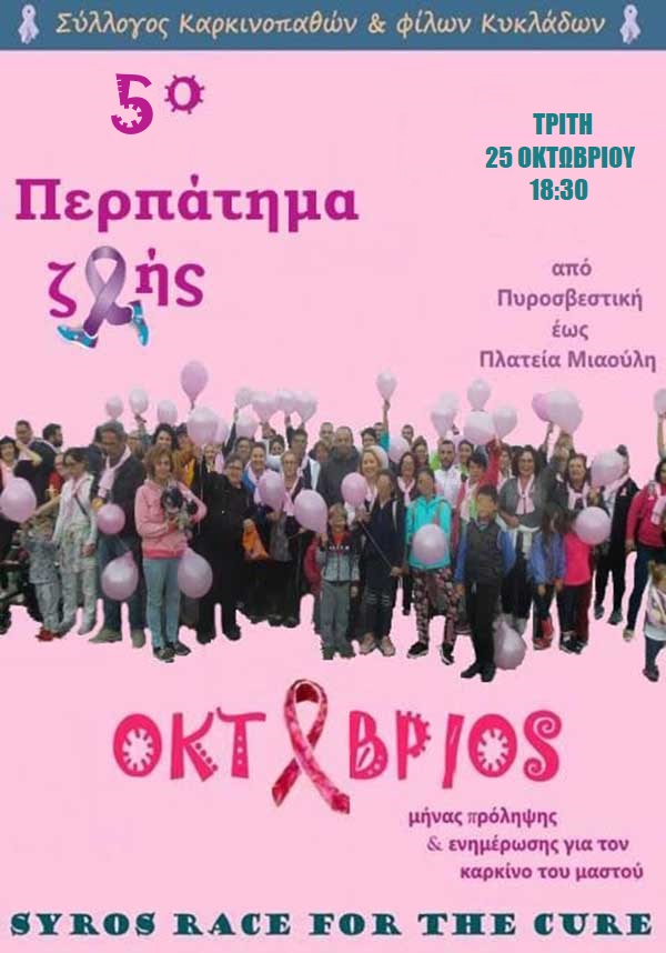 Ο Σύλλογος Καρκινοπαθών & Φίλων Κυκλάδων σας προσκαλεί στο 5ο Περπάτημα ζωής την Τρίτη 25 Οκτωβρίου στις 18:30.