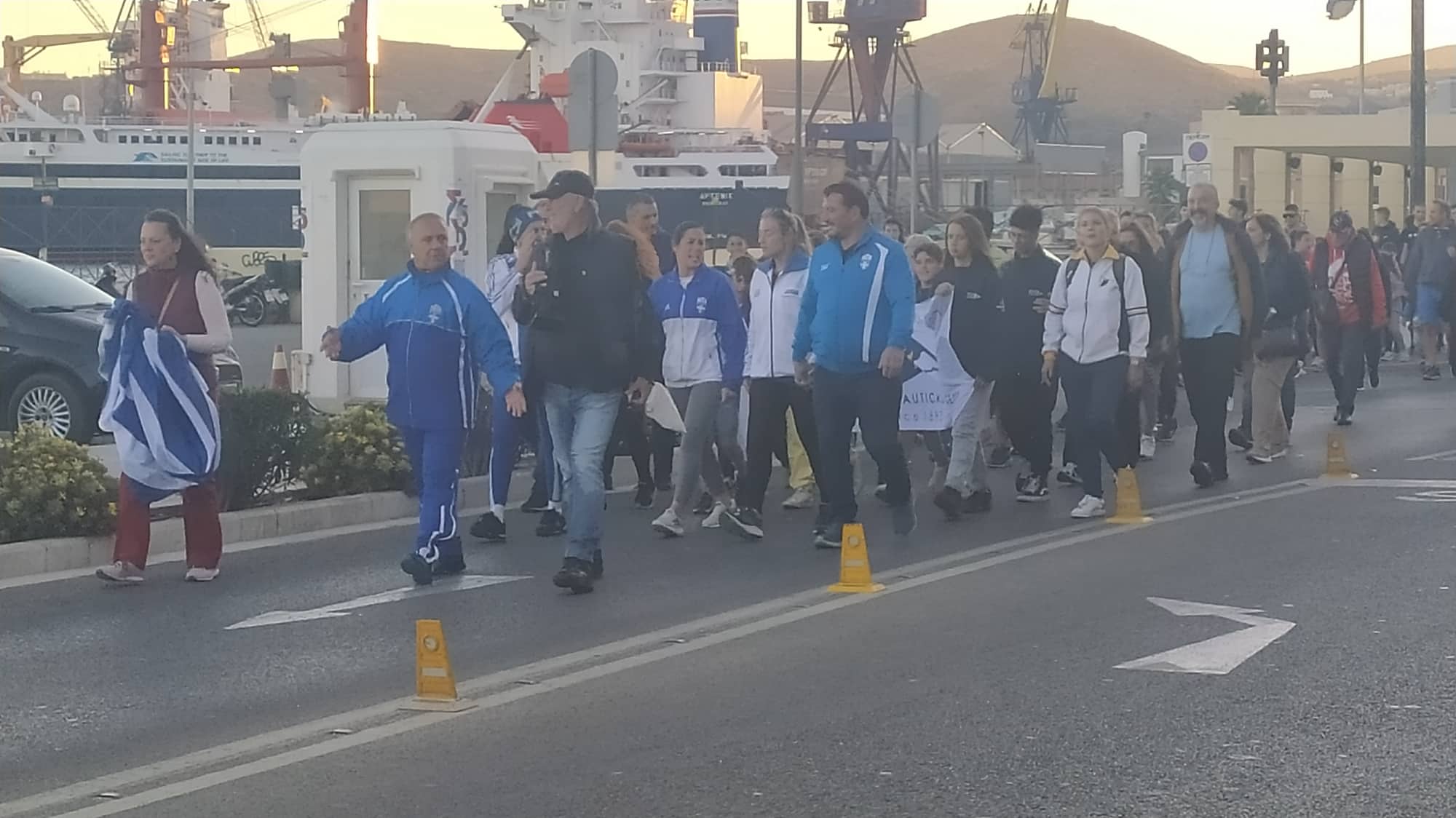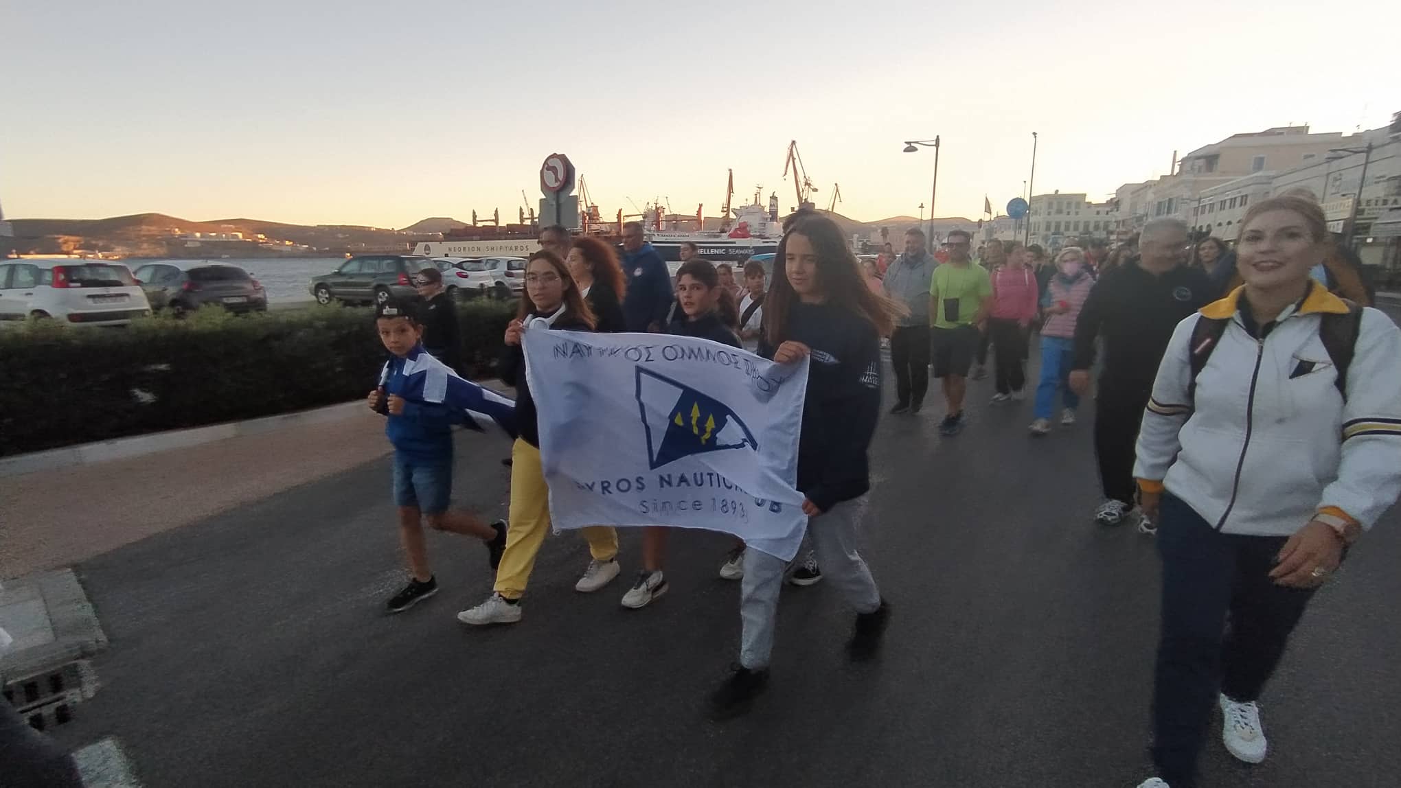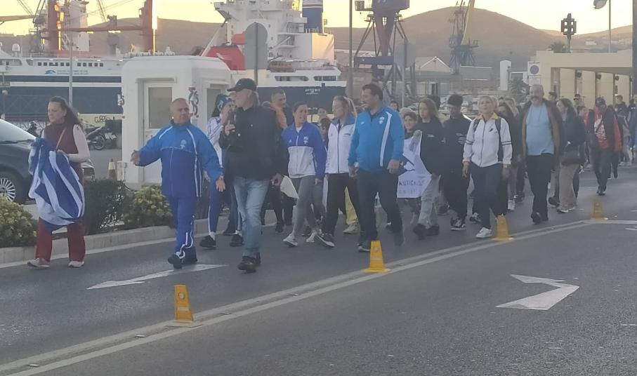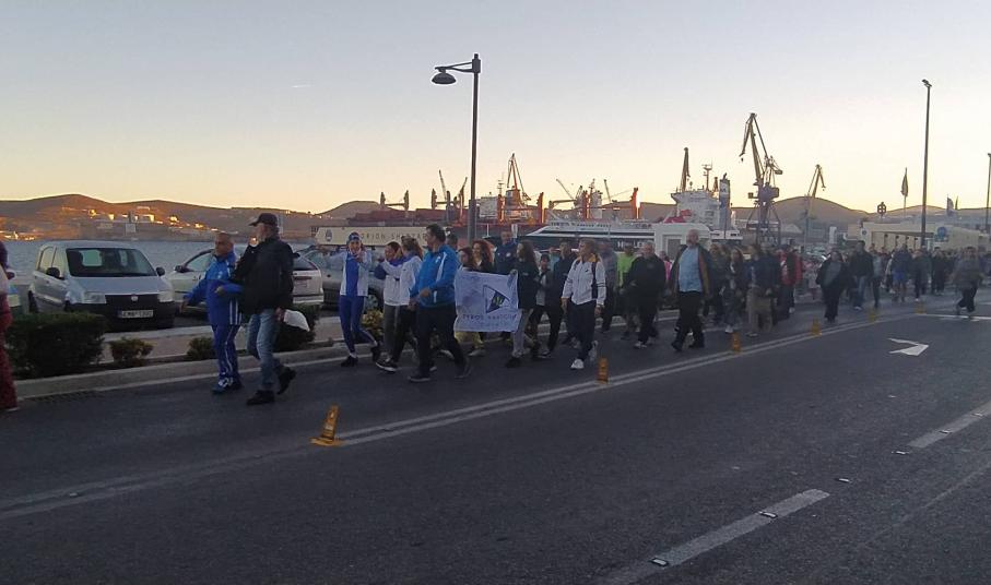 Το απόγευμα του Σαββάτου, 22 Οκτωβρίου, οι Ολυμπιονίκες και ελάχιστοι κάτοικοι της Σύρου συγκεντρώθηκαν στο κλειστό κολυμβητήριο από όπου ξεκίνησε μία συμβολική πορεία δύο χιλιομέτρων μέχρι την πλατεία Μιαούλη, με μία ενδιάμεση στάση στο άγαλμα της Εθνικής Αντιστάσεως, όπου οι Ολυμπιονίκες ξεδίπλωσαν την ελληνική σημαία και την μετέφεραν μέχρι το Δημαρχείο, υπό τους ήχους του Ολυμπιακού ύμνου. Εκεί, τοπικοί φορείς δαφνοστεφάνωσαν τους Ολυμπιονίκες και στη συνέχεια, όλοι μαζί, μοίρασαν πιστοποιητικά συμμετοχής στους παρευρισκόμενους. Η εκδήλωση, η οποία πραγματοποιήθηκε για δεύτερη φορά στη Σύρο, είχε σκοπό να ενημερώσει και να ευαισθητοποιήσει τους πολίτες για το δημογραφικό πρόβλημα της χώρας.