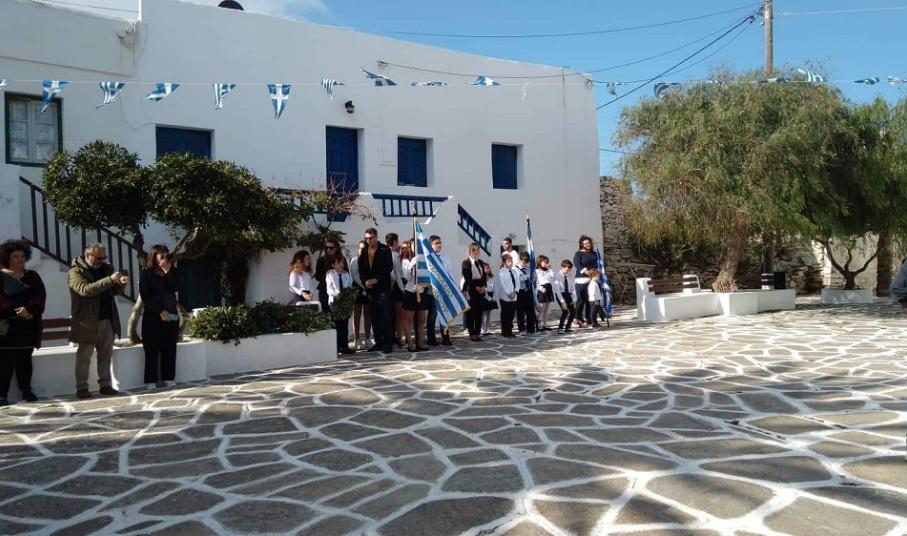 Στη Μύκονο παρέλασαν τα δημόσια και ιδιωτικά νηπιαγωγεία Χώρας και Φτελιάς – Μαραθιού, τα δημοτικά Σχολεία, τα Γυμνάσια και Λύκεια, το Ε.Π.Α.Λ., καθώς και οι πρόσκοποι. Η παρέλαση ξεκίνησε από το Δημαρχείο και κατέληξε στο μνημείο της Μαντώς Μαυρογένους. Ακολούθησαν παραδοσιακοί χοροί μαθητών και μαθητριών και έπειτα πραγματοποιήθηκε ειδική τελετή στο Δημαρχείο, κατά την οποία ο Δήμαρχος Μυκόνου βράβευσε τους επιτυχόντες Μυκονιάτες μαθητές των πανελληνίων.