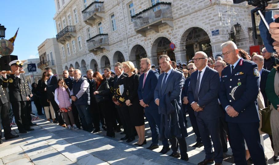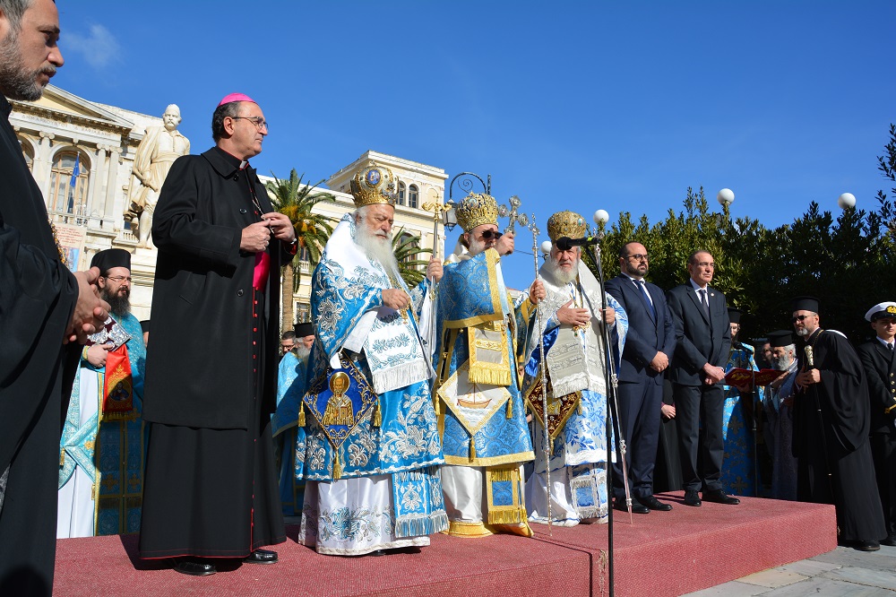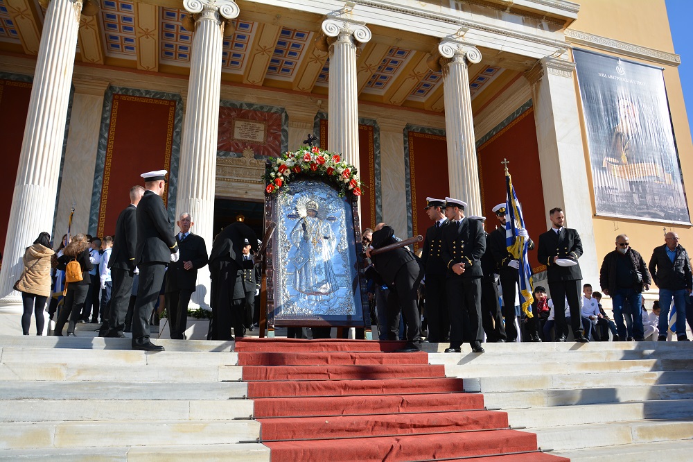 Από νωρίς το πρωί, πλήθος κόσμου συγκεντρώθηκε στον Ιερό Ναό όπου τελέστηκε η Θεία Λειτουργία προεξάρχοντος του Σεβασμιωτάτου Μητροπολίτου Βεροίας κ. Παντελεήμονος και συνιερουργούντων των Σεβασμιωτάτων Μητροπολιτών Κηφισίας κ. Κυρίλλου και Σύρου κ. Δωροθέου Β΄.  Αμέσως μετά το τέλος της λειτουργίας, ξεκίνησε η  λιτανεία της ιερής εικόνας,  συνοδεία της Φιλαρμονικής του Δήμου Σύρου Ερμούπολης, του Λυκείου Ελληνίδων, των σπουδαστών της Ναυτικής Ακαδημίας, αγήματος του Πολεμικού Ναυτικού, μαθητών, και προσκόπων. Η πομπή έκανε στάση στην πλατεία Μιαούλη όπου πραγματοποιήθηκε η ομιλία του κ. Δωρόθεου και εκπονήθηκε το εόρτιο άγγελμα προς τους πολίτες της Σύρου από τον δήμαρχο Σύρου Ερμούπολης, Ν. Λειβαδάρα.