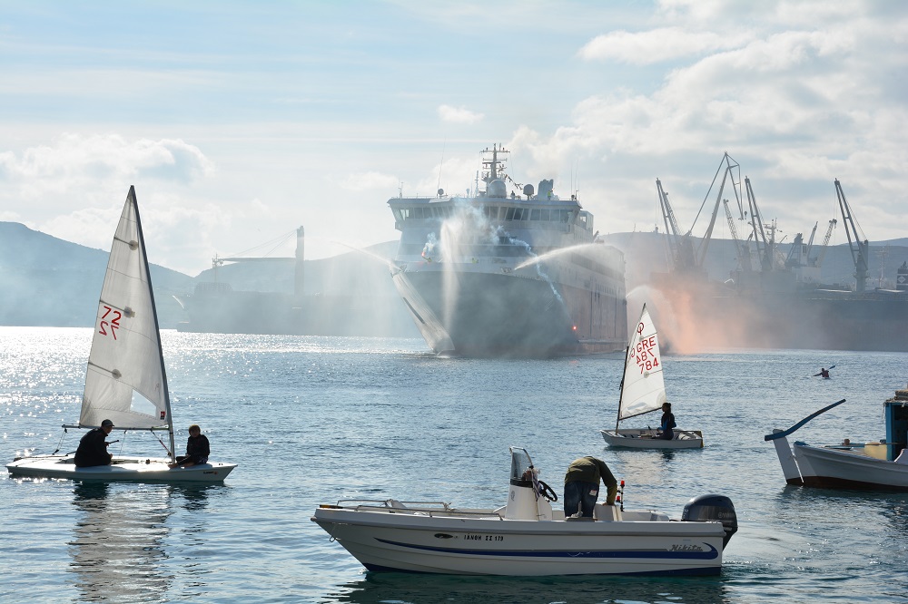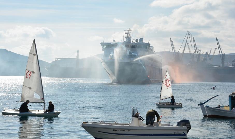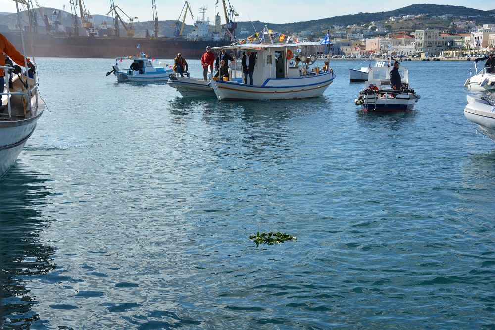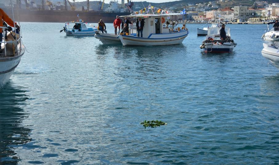 Στη συνέχεια, η περιφορά της εικόνας κατευθύνθηκε προς την πλατεία Κανάρη όπου έγινε ρίψη στεφάνων στη θάλασσα από εκπροσώπους της εκκλησίας, της πολιτικής και του Λιμενικού, στη μνήμη των πνιγέντων ναυτικών.