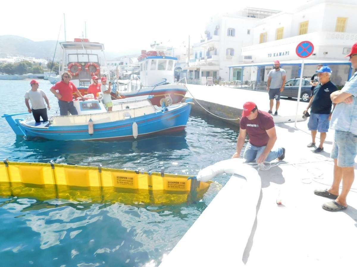1ο μέρος: Συνοπτική επίδειξη του εξοπλισμού αντιμετώπισης θαλάσσιας ρύπανσης που διαθέτει το Δ.Λ.Τ. Αμοργού και θα χρησιμοποιηθεί στην Άσκηση.