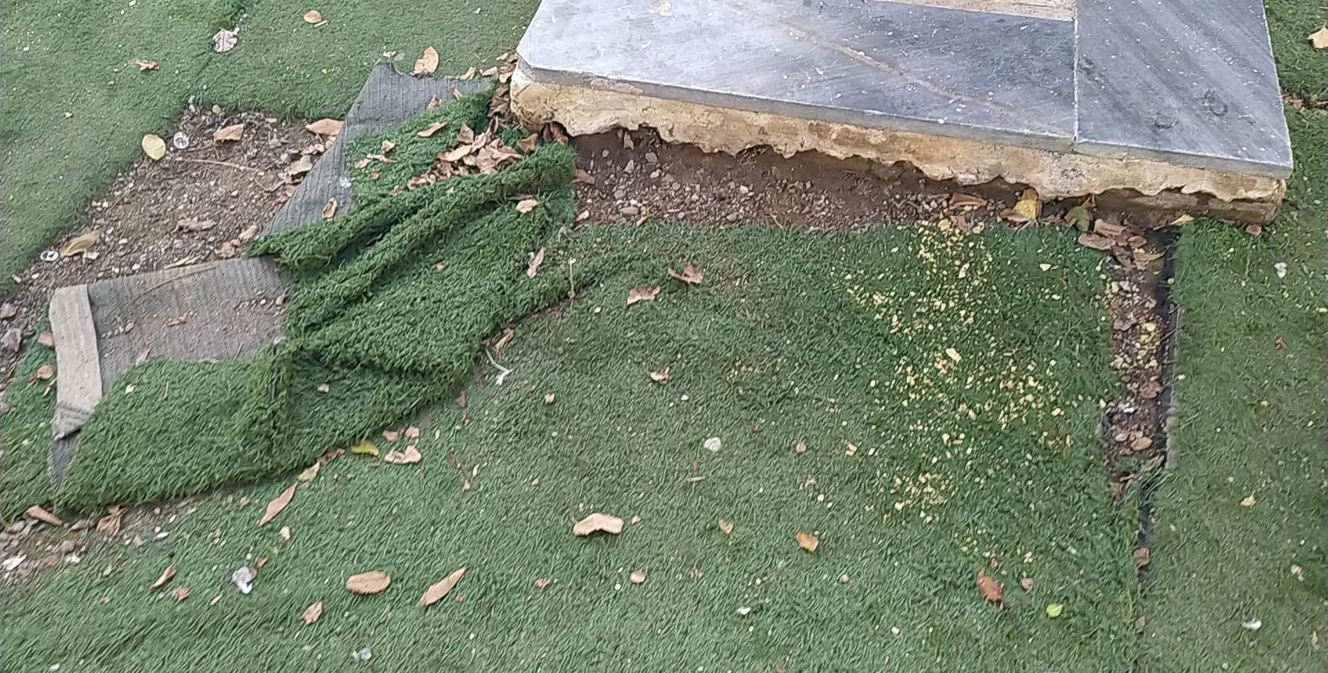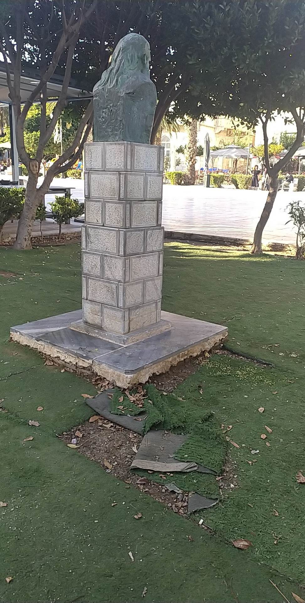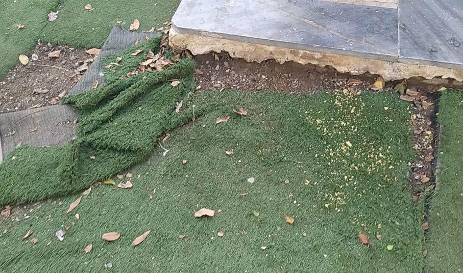 Το υλικό που επιλέχθηκε, προφανώς για να δίνει την αίσθηση του πρασίνου, το οποίο έχει αλλοιωθεί από το πέρασμα του χρόνου και τις καιρικές συνθήκες, οι τυχαία τοποθετημένες σωληνώσεις και το διαβρωμένο έδαφος, δίνουν την εντύπωση ενός αφημένου στην τύχη του σημείου του νησιού, παρόλο που αυτό βρίσκεται στην κεντρικότερη και εμβληματικότερη τοποθεσία του.
