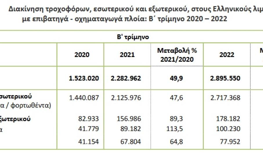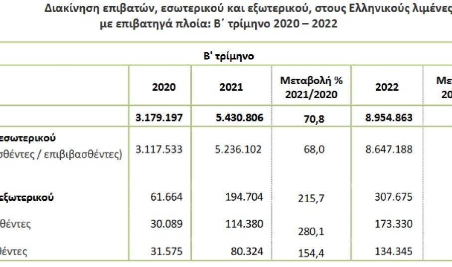 Η συνολική διακίνηση επιβατών στους Ελληνικούς λιμένες το β ́ τρίμηνο 2022 σε σύγκριση με το β΄ τρίμηνο του 2021 παρουσίασε αύξηση κατά 64,9%, ενώ και κατά την αντίστοιχη σύγκριση του β΄ τριμήνου 2021 προς το β΄ τρίμηνο 2020 παρατηρήθηκε αύξηση κατά 70,8%.