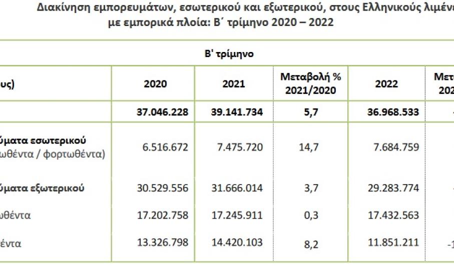 Η συνολική διακίνηση εμπορευμάτων στους Ελληνικούς λιμένες το β΄ τρίμηνο 2022 σε σύγκριση με το β΄ τρίμηνο του 2021 παρουσίασε μείωση κατά 5,6%, ενώ κατά την αντίστοιχη σύγκριση του β΄ τριμήνου 2021 προς το β ́ τρίμηνο 2020 παρατηρήθηκε αύξηση κατά 5,7%.