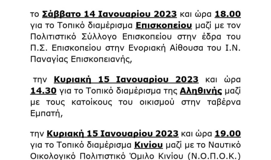 το Σάββατο 14 Ιανουαρίου 2023 και ώρα 18.00 για το Τοπικό διαμέρισμα Επισκοπείου μαζί με τον Πολιτιστικό Σύλλογο Επισκοπείου στην έδρα του Π.Σ. Επισκοπείου στην Ενοριακή Αίθουσα του Ι.Ν. Παναγίας Επισκοπειανής,