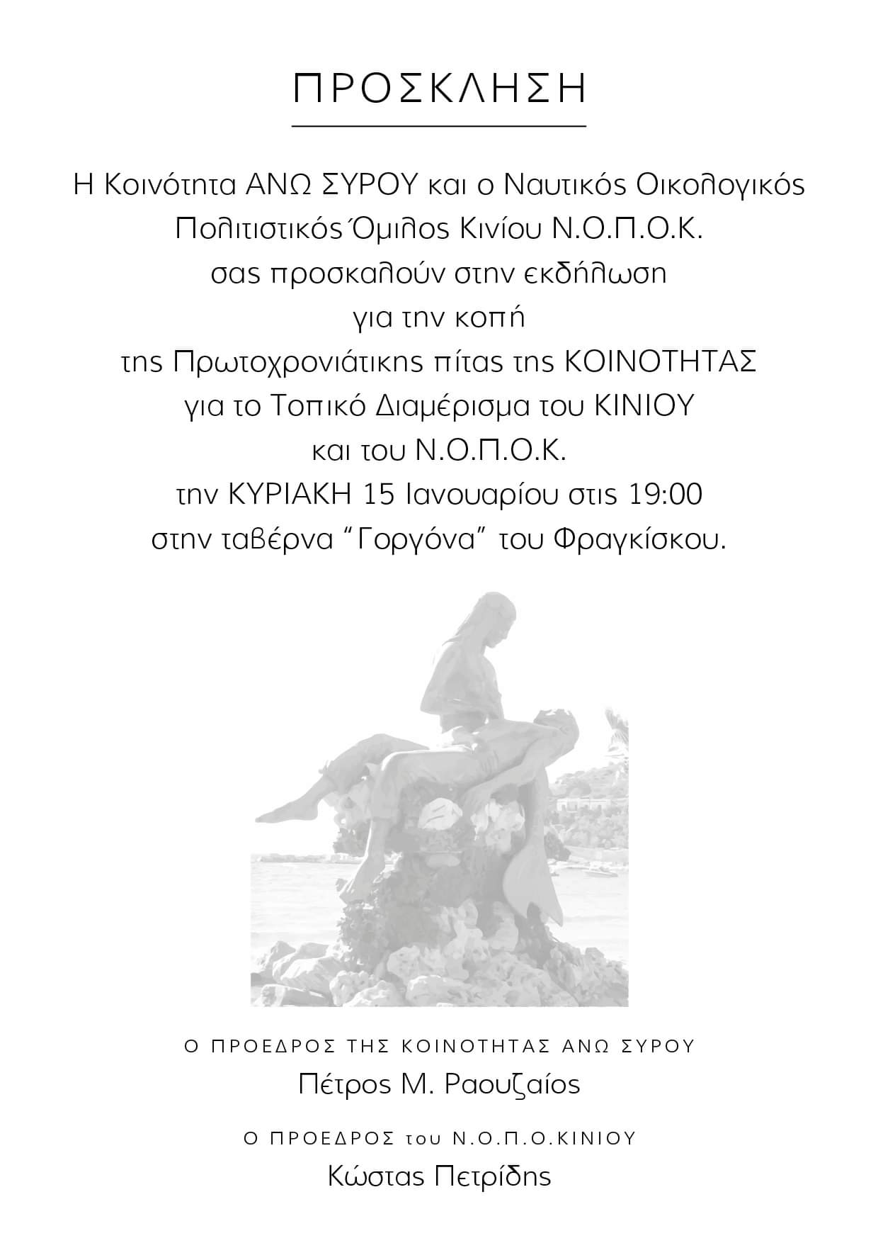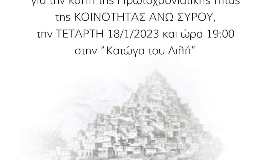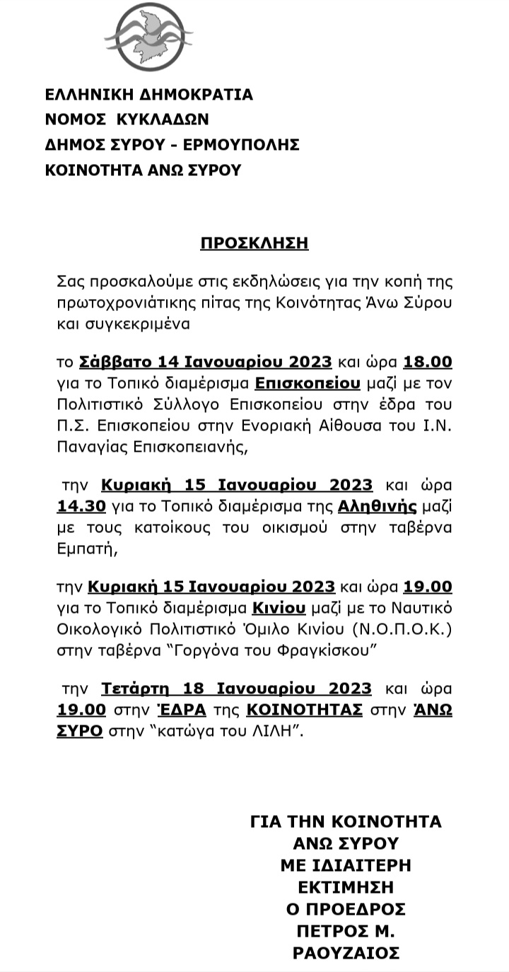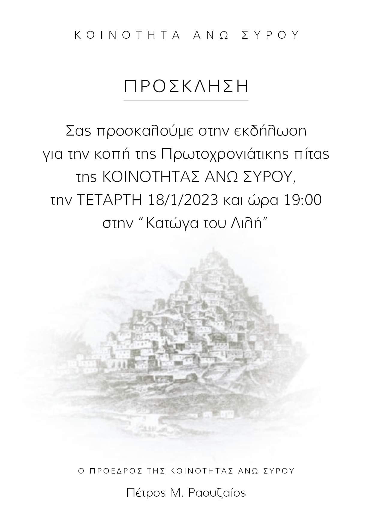 "Σας προσκαλούμε στις εκδηλώσεις για την κοπή της πρωτοχρονιάτικης πίτας της Κοινότητας Άνω Σύρου και συγκεκριμένα