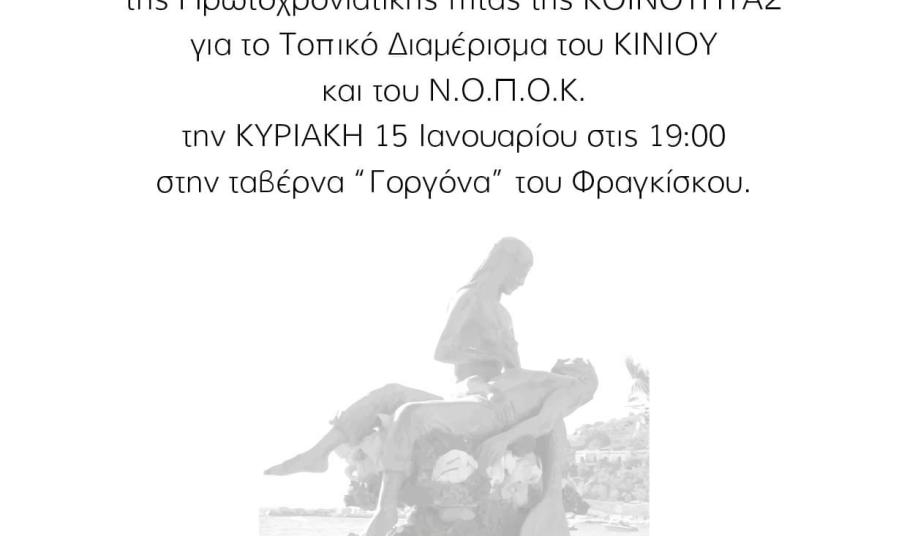 την Κυριακή 15 Ιανουαρίου 2023 και ώρα 19.00 για το Τοπικό διαμέρισμα Κινίου μαζί με το Ναυτικό Οικολογικό Πολιτιστικό Όμιλο Κινίου (Ν.Ο.Π.Ο.Κ.) στην ταβέρνα “Γοργόνα του Φραγκίσκου”