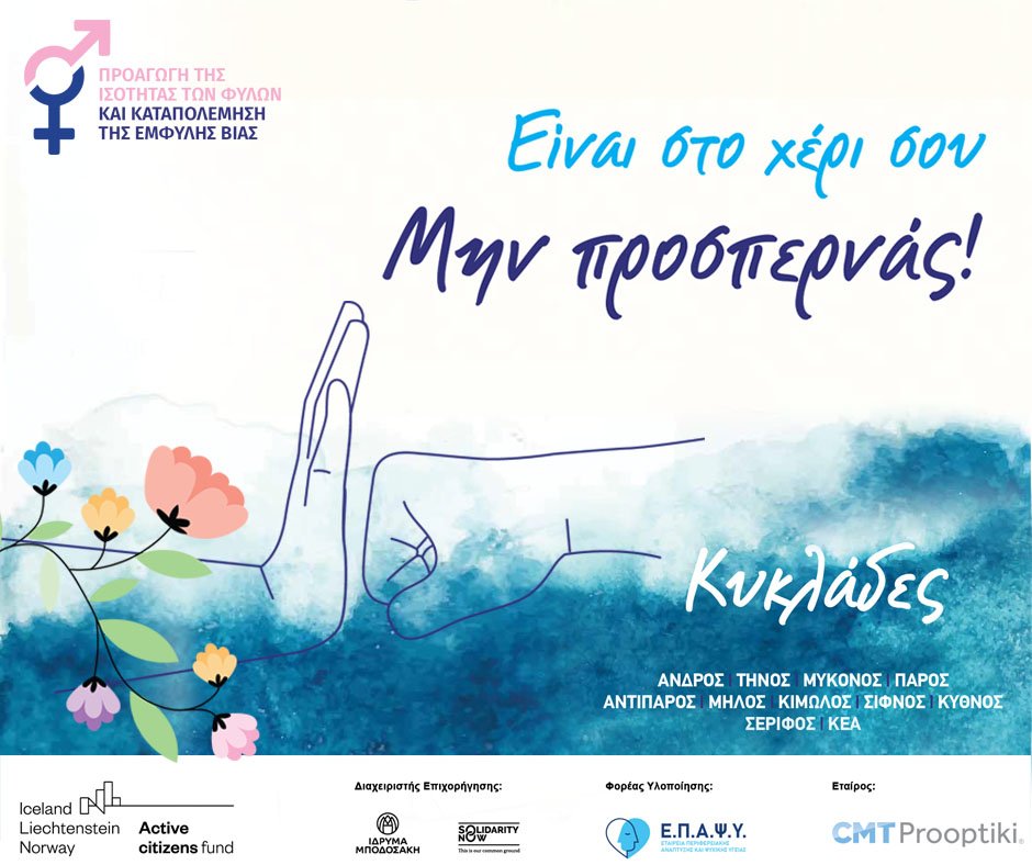 Το πρόγραμμα «Προαγωγή της Ισότητας των Φύλων και Καταπολέμηση της Έμφυλης Βίας», που υλοποιείται τη χρονική περίοδο Μάρτιος 2022- Αύγουστος 2023, καλείται να αντιμετωπίσει τις πολλαπλές διαστάσεις της βίας και να προάγει την έμφυλη ισότητα στα νησιά, τα οποία δεν διαθέτουν εξειδικευμένα συμβουλευτικά κέντρα σε θέματα ισότητας των φύλων. Συγκεκριμένα, στοχεύει στην ενημέρωση, ευαισθητοποίηση και εκπαίδευση σε ζητήματα έμφυλης βίας και ισότητας μέσω πολλαπλών δράσεων της Κινητής Μονάδας Ψυχικής Υγείας (ΚΜΨΥ) της ΕΠΑΨΥ στην ευρύτερη κοινότητα των νησιών Άνδρου, Τήνου, Μυκόνου, Πάρου, Αντιπάρου, Μήλου, Κιμώλου, Σίφνου, Κύθνου, Σερίφου και Κέας.