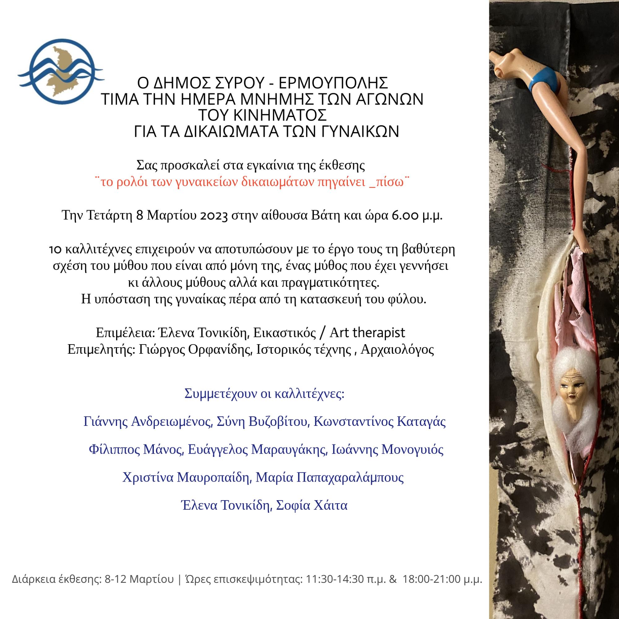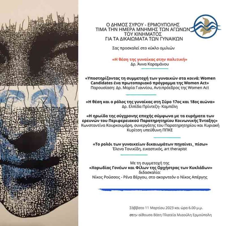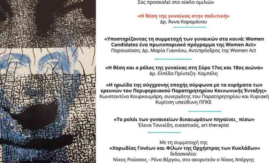 Όπως κάθε χρόνο, ο Δήμος Σύρου - Ερμούπολης, με αφορμή τη «Παγκόσμια Ημέρα της Γυναίκας», προγραμματίζει δράσεις που στοχεύουν στην ανάδειξη της διαφορετικής θέασης/ανάγνωσης των δικαιωμάτων της γυναίκας στη σύγχρονη εποχή. Φέτος, τιμώντας την Ημέρα Μνήμης των Αγώνων του Κινήματος για τα Δικαιώματα των Γυναικών, διοργανώνει μία έκθεση ζωγραφικής καθώς και έναν κύκλο ομιλιών με τη συμμετοχή σημαντικών καλλιτεχνών, συγγραφέων και επιστημόνων.