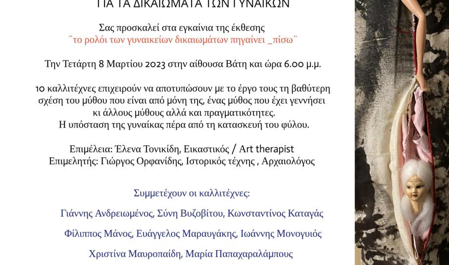 Η εικαστικός κα Ελενα Τονικίδη και ο ιστορικός τέχνης και αρχαιολόγος κος Γιώργος Ορφανίδης επιμελούνται την έκθεση με θέμα: «Το ρολόι των γυναικείων δικαιωμάτων πηγαίνει πίσω».