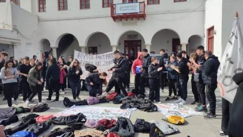 Και στη Μύκονο οι μαθητές του Γενικού Λυκείου του νησιού, αφού ξεκίνησαν μία απορία συγκεντρώθηκαν και διαδήλωσαν ειρηνικά έξω από το δημαρχιακό Μέγαρο Μυκόνου. Εκεί με συνθήματα και με πανό που κρατούσαν διαμαρτυρήθηκαν για τους νεκρούς των Τεμπών και αναρωτήθηκαν για τις αιτίες που οδήγησαν στο θάνατο τόσους νέους ανθρώπους. Ένα από τα συνθήματα των παιδιών που σημάδεψαν τη διαδήλωση ήταν “Όλων των νεκρών γινόμαστε η φωνή, η νέα γενιά δεν σας συγχωρεί”.