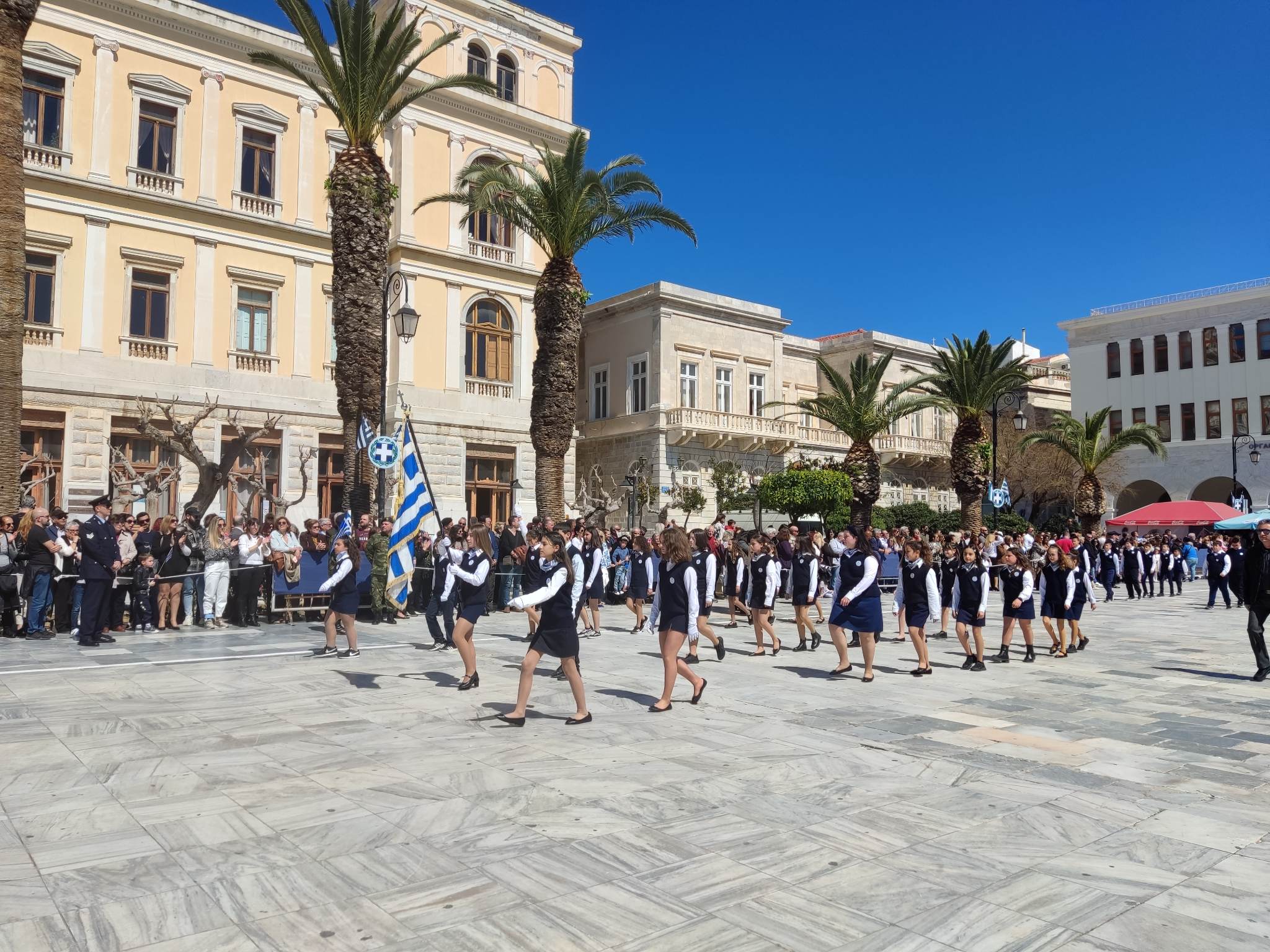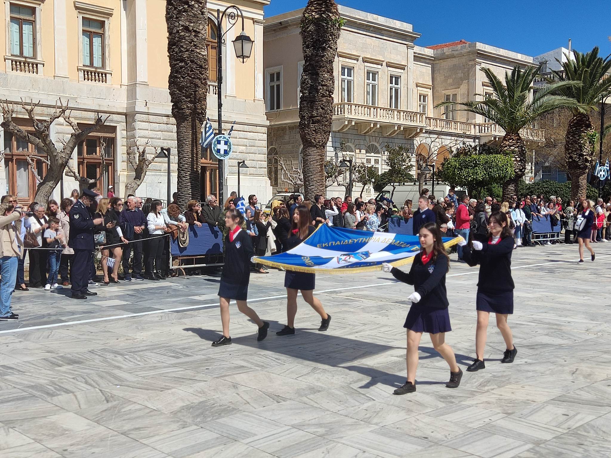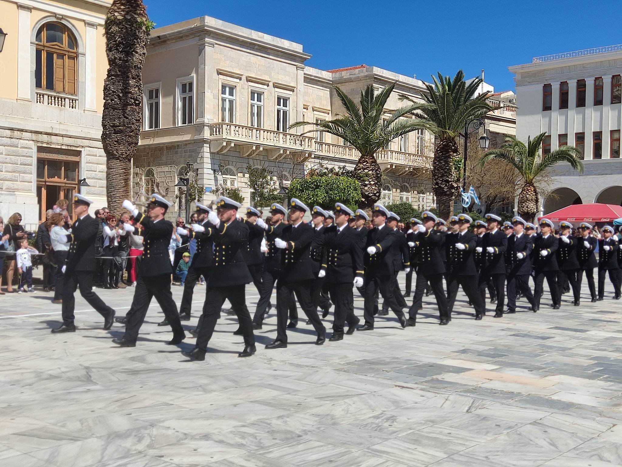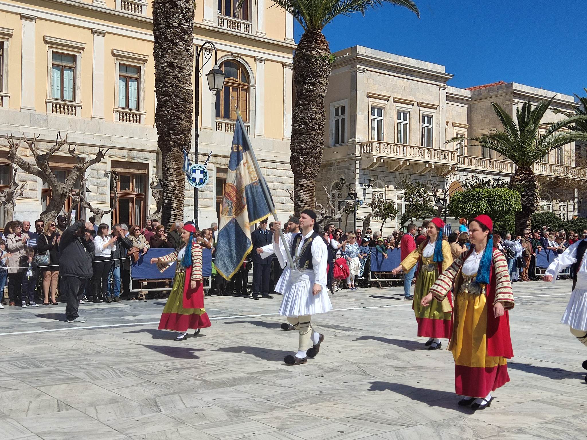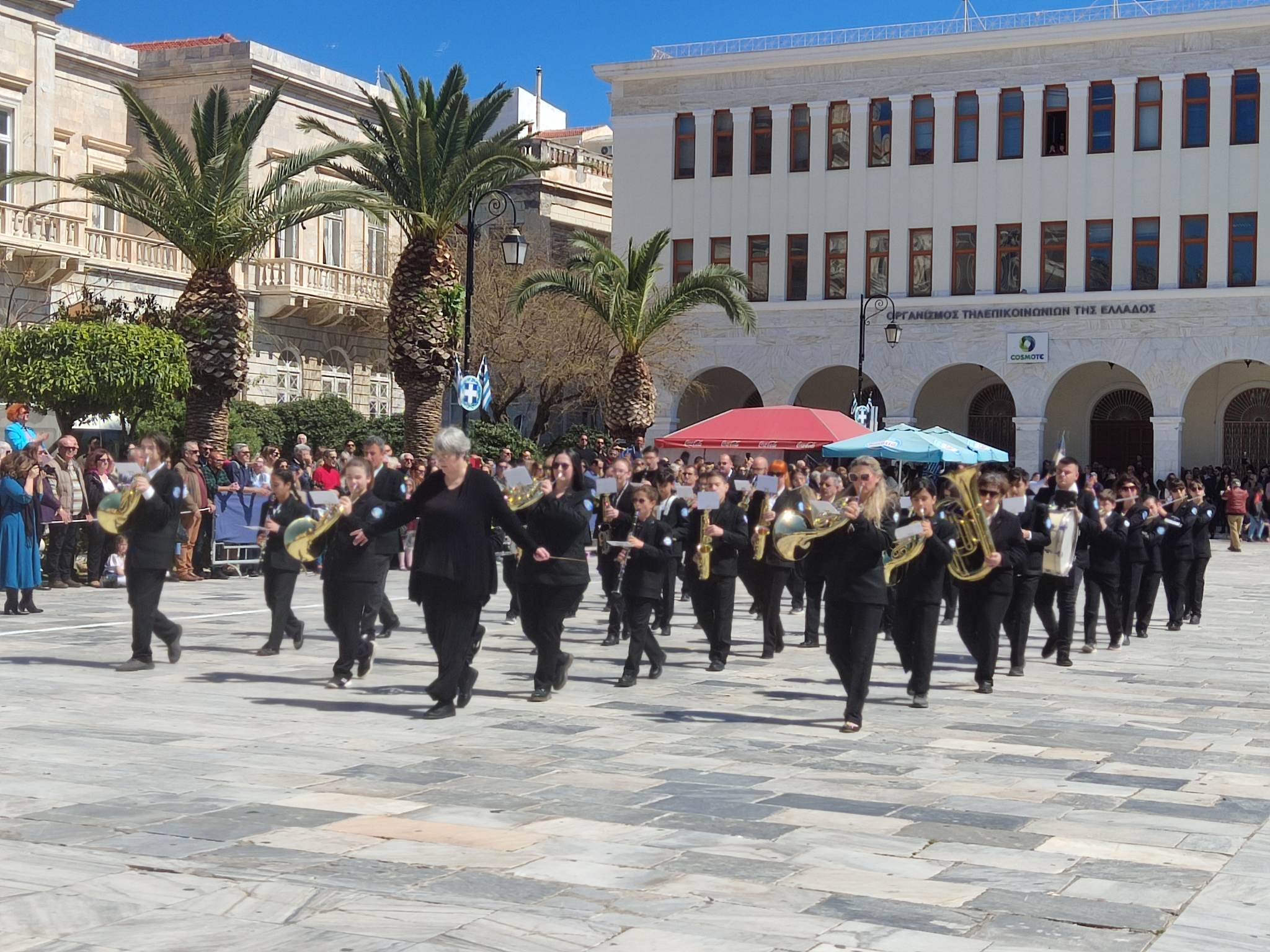Αμέσως μετά, νέοι και νέες παρέλασαν στην πλατεία Μιούλη, υπό την “καθοδήγηση” της Φιλαρμονικής, με πλήθος κόσμου να παρακολουθεί, ενώ νωρίτερα το πρωί έλαβε χώρα η αποκάλυψη της πολεμικής σημαίας από το ΤΕΘ Ερμούπολης έμπροσθεν του ανδριάντα του Ναυάρχου Μιαούλη..