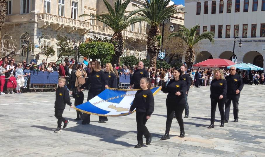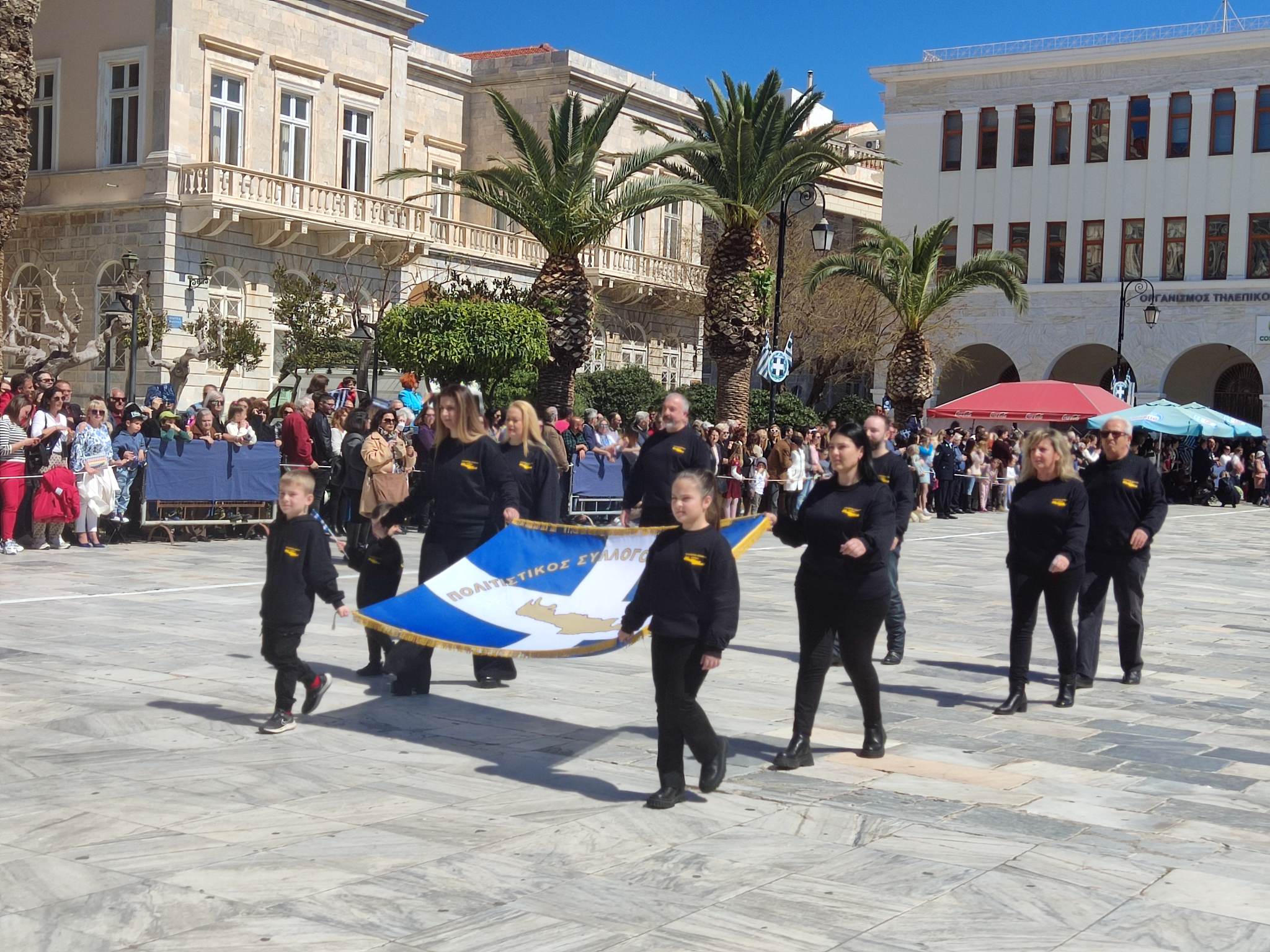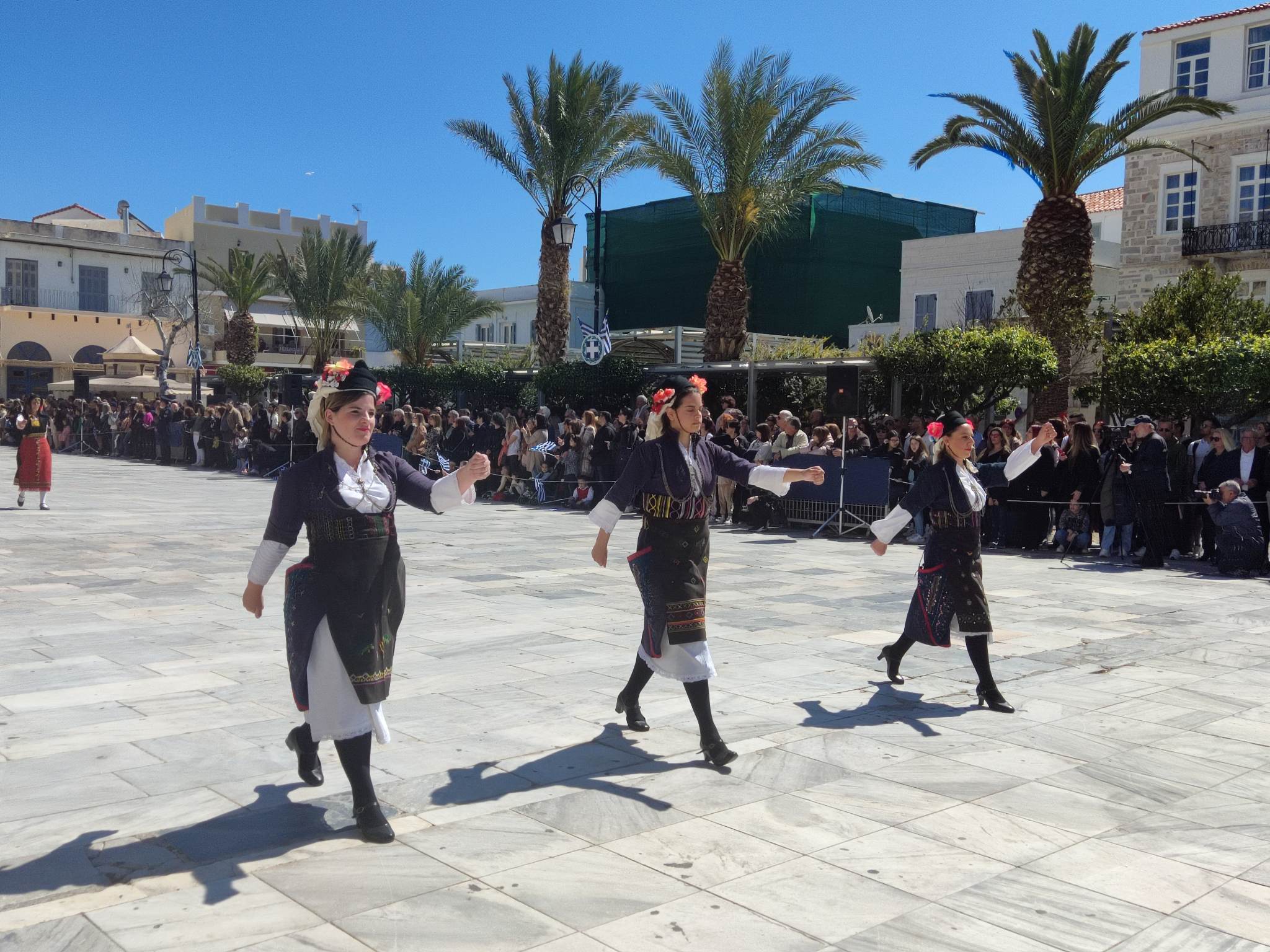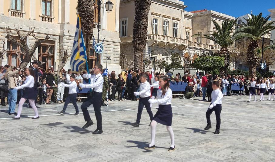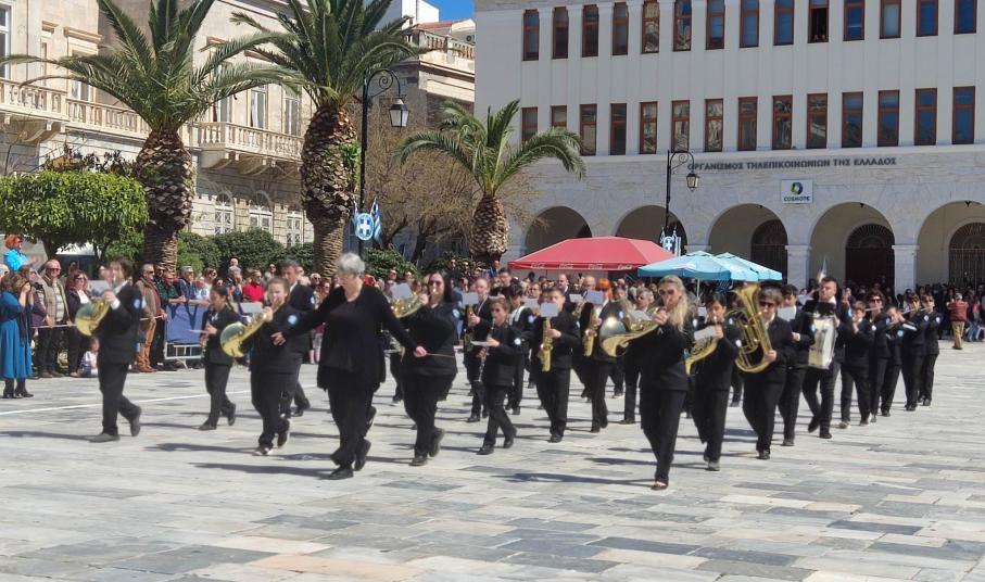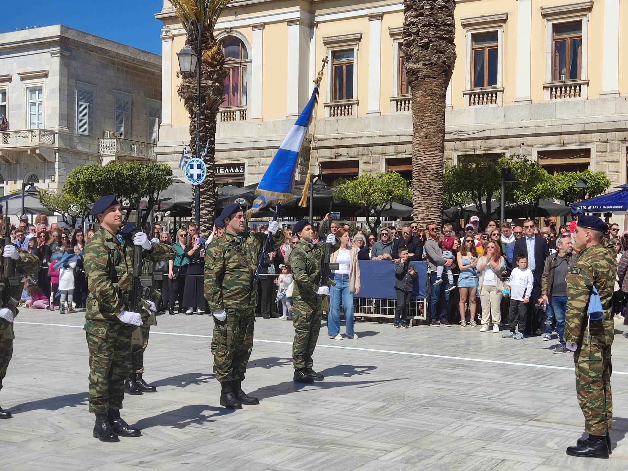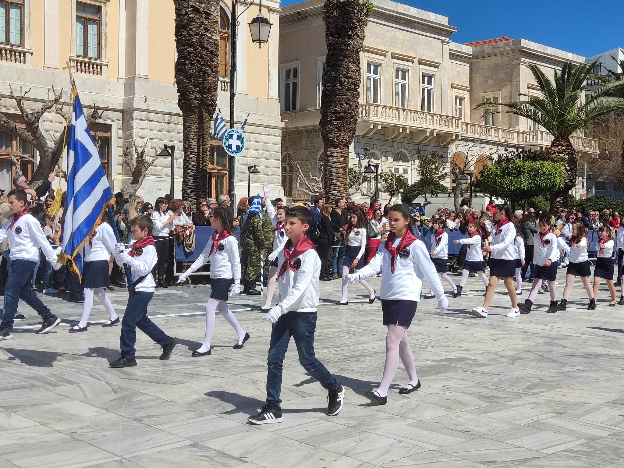 Αμέσως μετά, νέοι και νέες παρέλασαν στην πλατεία Μιούλη, υπό την “καθοδήγηση” της Φιλαρμονικής, με πλήθος κόσμου να παρακολουθεί, ενώ νωρίτερα το πρωί έλαβε χώρα η αποκάλυψη της πολεμικής σημαίας από το ΤΕΘ Ερμούπολης έμπροσθεν του ανδριάντα του Ναυάρχου Μιαούλη..
