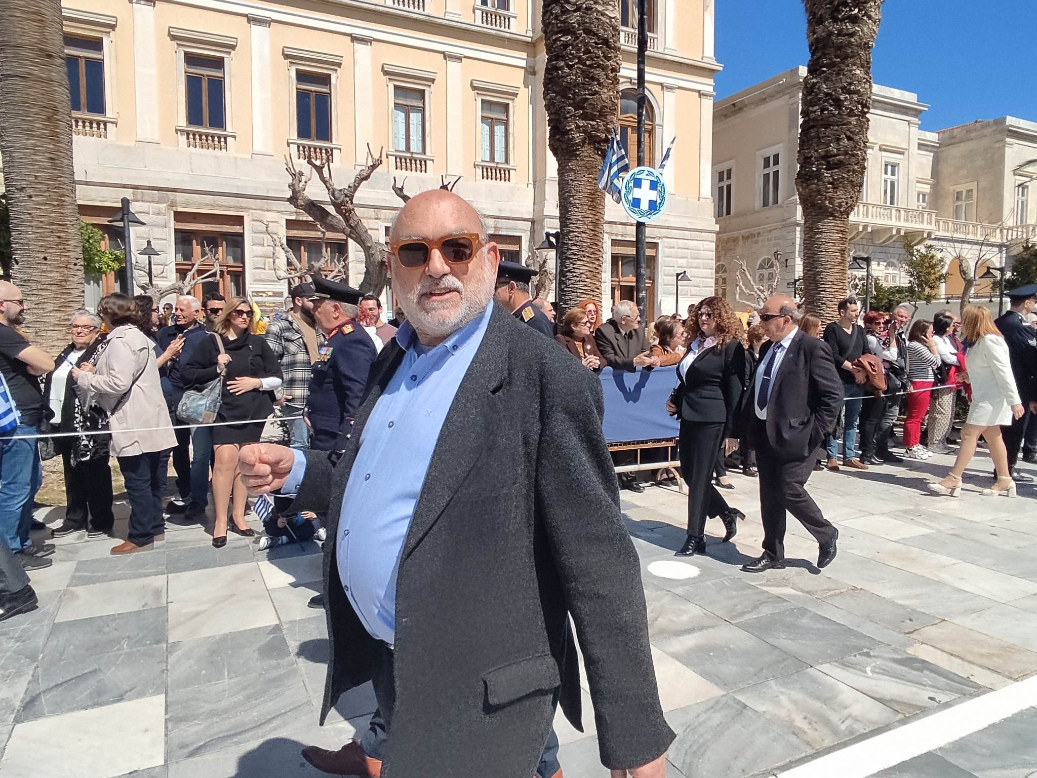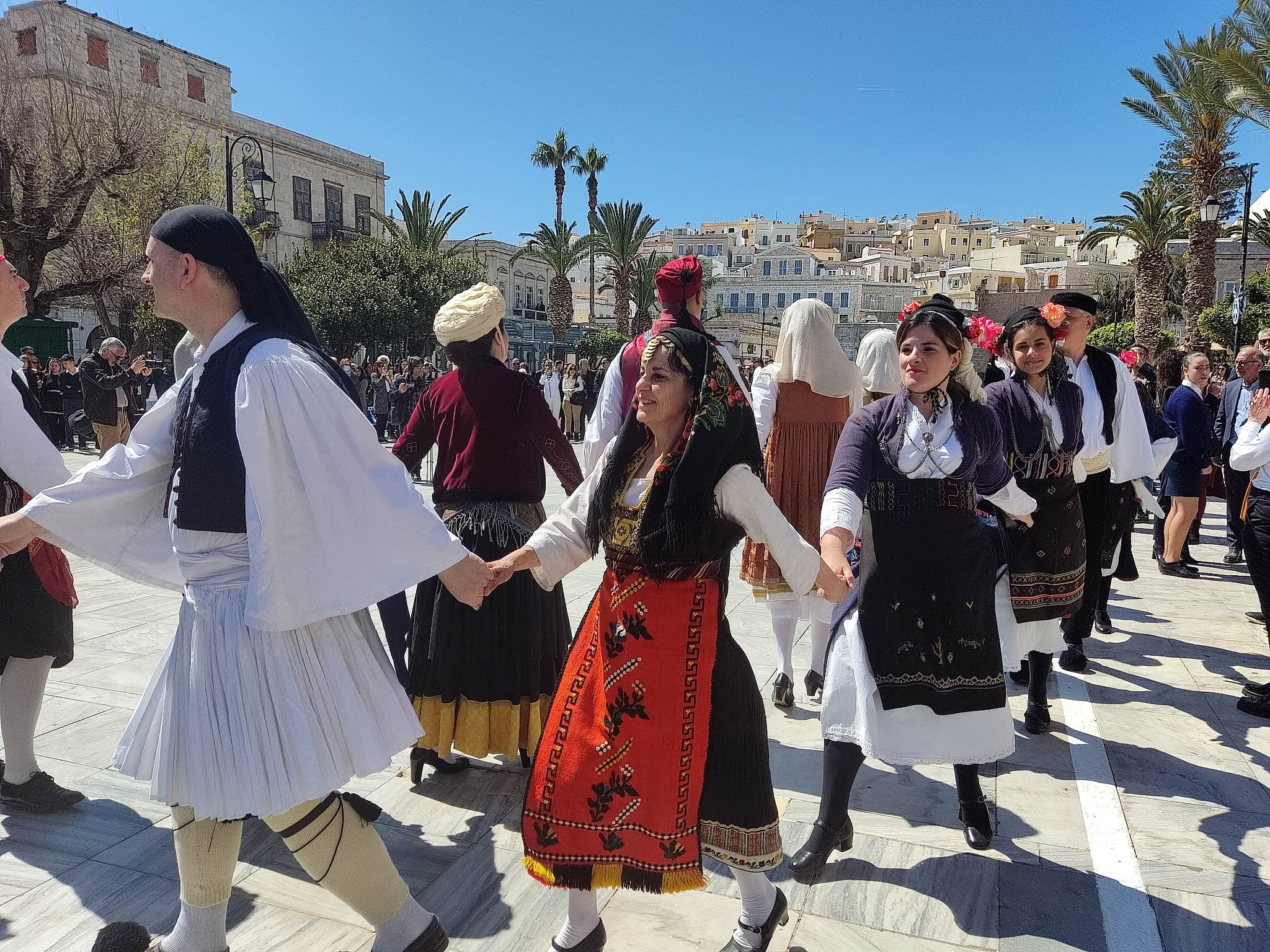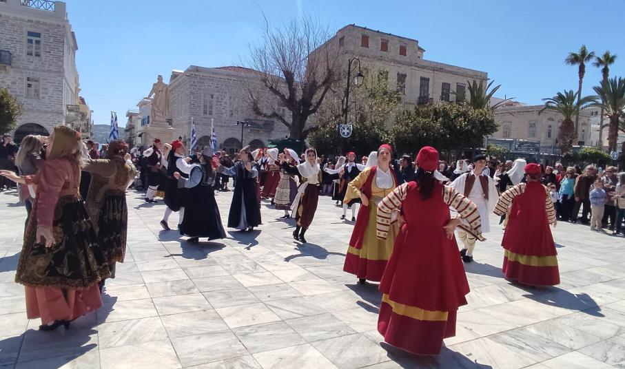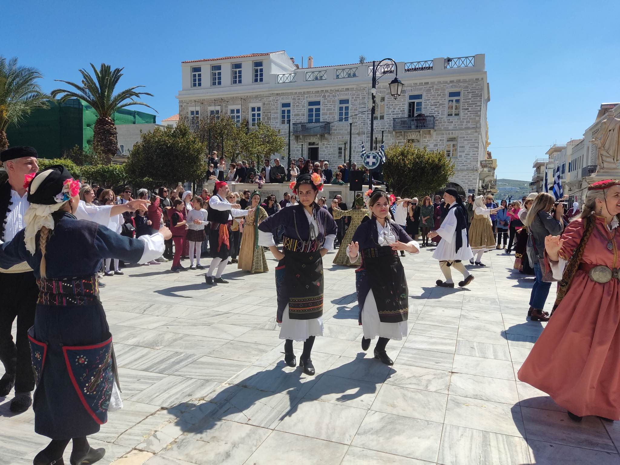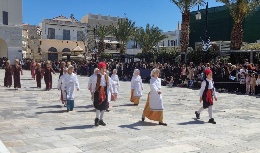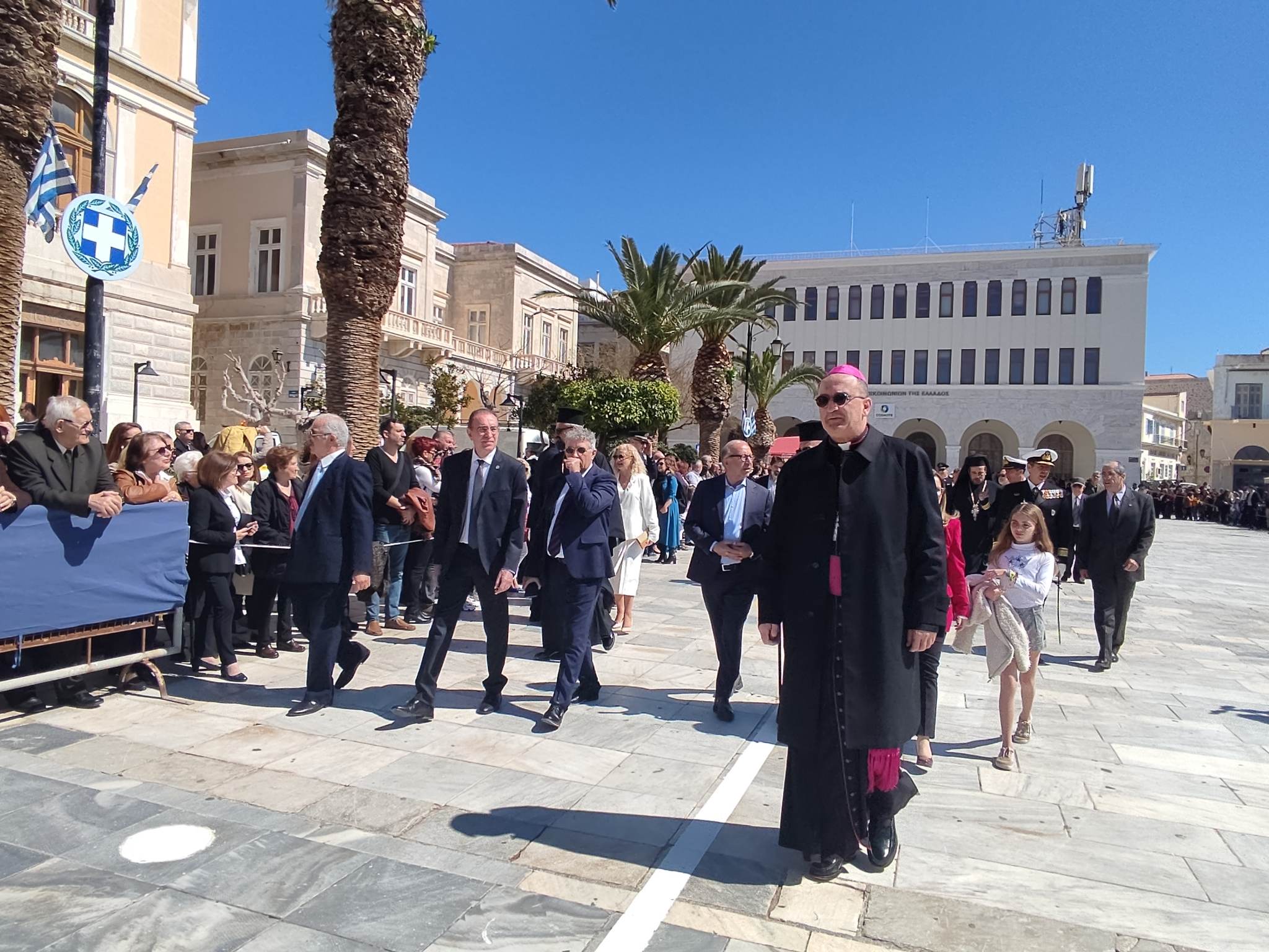 Η παρέλαση στην πλατεία Μιαούλη αποτέλεσε την κορύφωση των επετειακών εκδηλώσεων για την 25η Μαρτίου, της οποίας προηγήθηκε η δοξολογία στον Ι.Ν. του Αγίου Νικολάου Ερμούπολης, με τη συμμετοχή πολλών εκπροσώπων της Αυτοδιοίκησης του Α΄ και του Β΄ βαθμού, εκπροσώπων φορέων και κομματικών οργανώσεων, βουλευτών του νομού και εκπροσώπων των Σωμάτων Ασφαλείας. Η επιμνημόσυνη δέηση έγινε στο εθνικό ηρώο της πόλης και συγκεκριμένα στο κηπάριο μπροστά από τον Ι.Ν. του Αγίου Νικολάου, όπου και κατατέθηκαν στεφάνια.