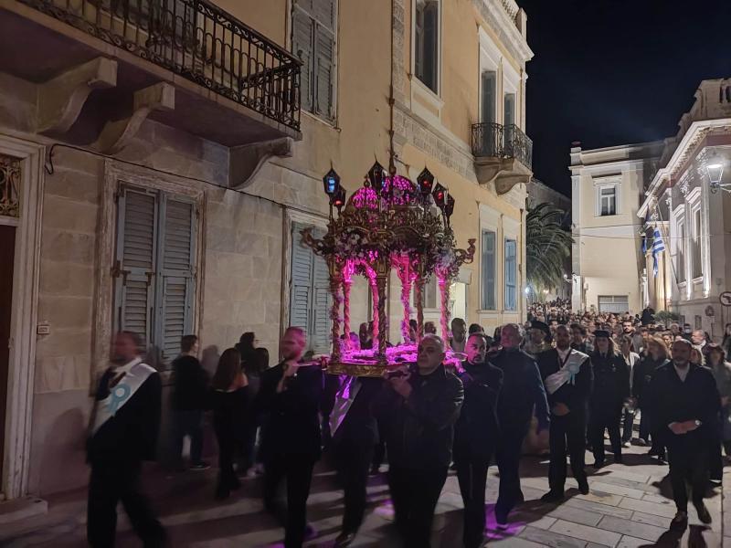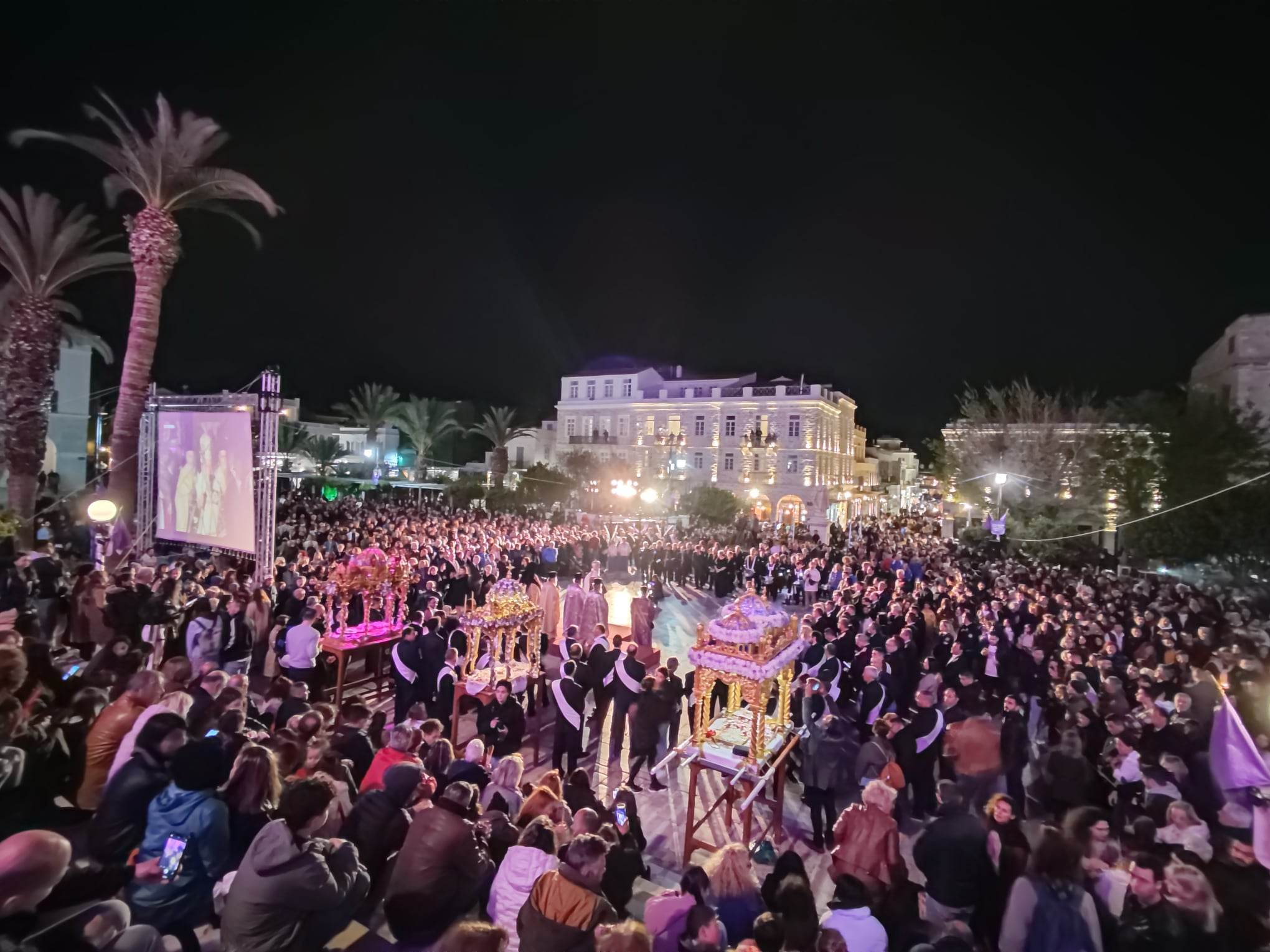 Οι επιτάφιοι συγκεντρώθηκαν λίγο μετά τις 22.00 στην πλατεία Μιαούλη, από την οποία λίγο νωρίτερα είχε πραγματοποιηθεί και η περιφορά του Επιταφίου της Καθολικής Εκκλησίας του Ι.Ν. Ευαγγελιστρίας. Ο κόσμος είχε κατακλύσει τους γύρω δρόμους, ενώ μπροστά στο Δημαρχιακό Μέγαρο είχαν στηθεί γιγαντοοθόνες που έδειχναν τα εντυπωσιακά πλάνα της εκδήλωσης.