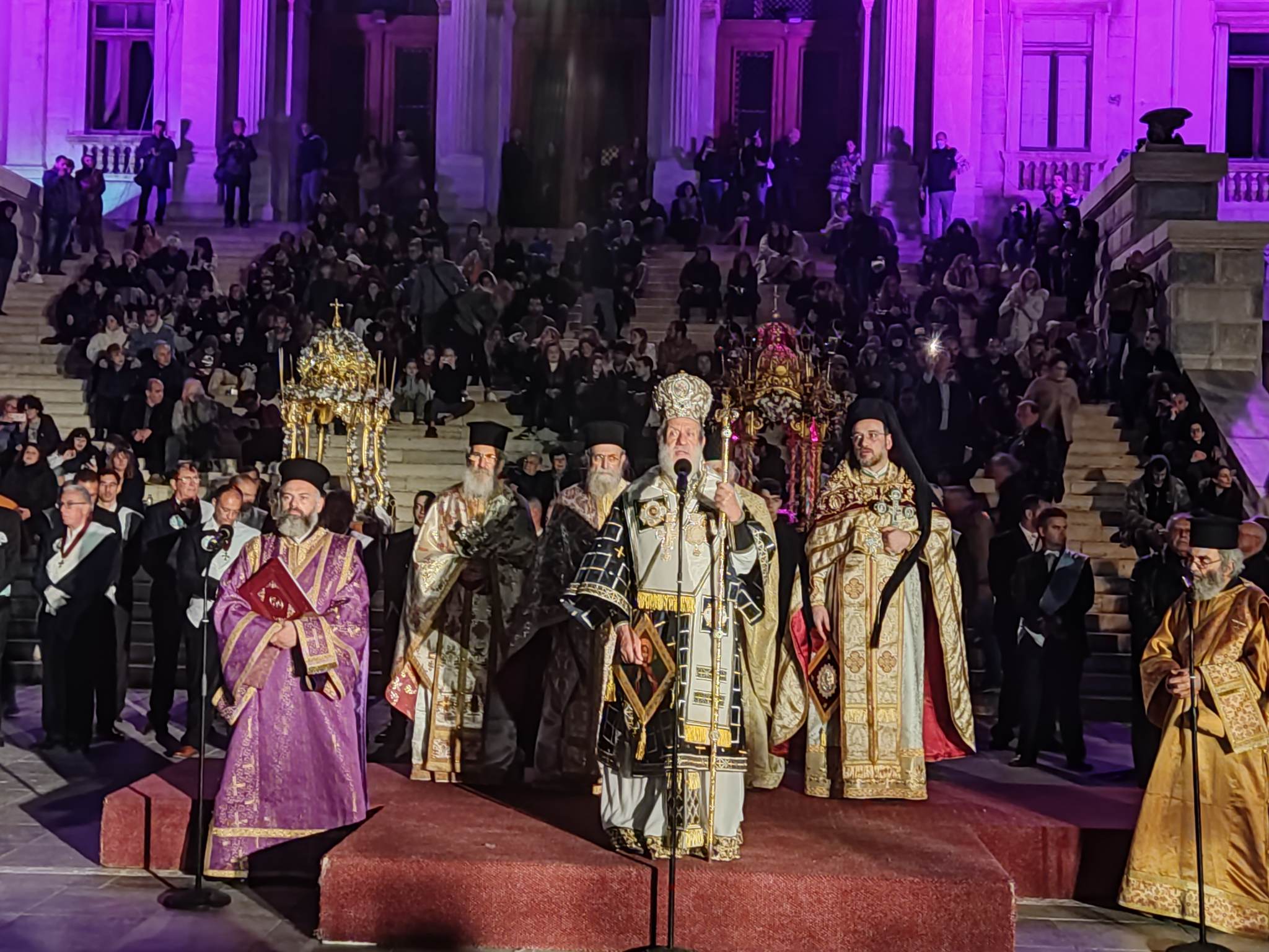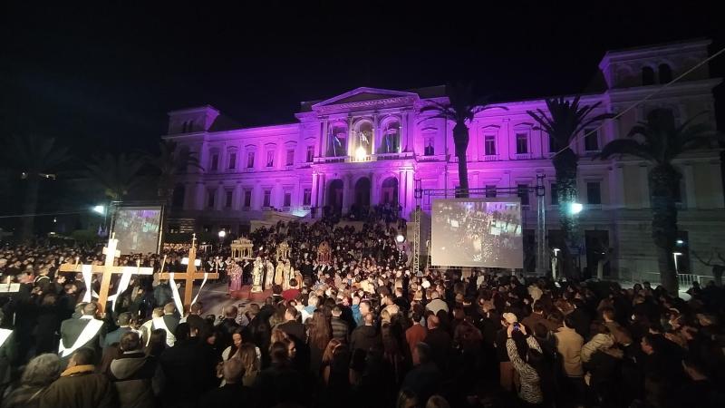 Μετά την προσέλευση και των τριών επιταφίων στην πλατεία Μιαούλη, ο μητροπολίτης Σύρου, Δωρόθεος Β’, ανέπεμψε δέηση και απευθύνθηκε στους πιστούς: “Κάθε ιστορικό γεγονός που έχει συμβεί σε μία ιστορική στιγμή, καθίσταται πράγματι ιστορικό και γεγονός το οποίο εκείνη τη συγκεκριμένη στιγμή κατέγραψε η ιστορία. Μετα απο λίγο όμως, αυτό το ίδιο γεγονός καθίσταται παρωχημένο, ανήκει στο παρελθόν και μόνο οι συνέπειές του έρχονται να αγγίξουν το χρόνο. Με τη ζωή όμως του Χριστού, τη διδασκαλία Του, τη Σταύρωσή Του, την Ανάστασή Του και την Ανάληψή Του στους ουρανούς δεν συμβαίνει το ίδιο. Συνέβησαν όμως σε μία ιστορική συγκεκριμένη χρονική στιγμή και είναι όντως ιστορικά γεγονότα. Δεν είναι όμως παρωχημένα, δεν είναι πρελθόντα. Είναι πάντοτε επίκαιρα, είναι πάντοτε παρόντα. Όπως αυτό που ζούμε απόψε, χθες, προχθες. Την σταυρωση του Κυρίου, την ταφή και αύριο την Ανάσταση. Είναι, όχι απλώς σαν να τα ζούμε σήμερα αλλά είναι γεγονότα που νομίζουμε πως τα γνωρίζουμε και πως μέσα στην ψυχή μας υφαίνει τη δόξα του σε ιστορία κάθε χρόνο σαν να είναι η πρώτη φορά. Έστι βιώσαμε και ζήσαμε και αυτήν την αγία και Μεγάλη Εβδομάδα. Γεγονότα τα οποία δεν ήρθαν μέσα από μία ομίχλη 20 αιώνων ξαφνικά να σημάνουν κάτι εφέτος και πάλι στη ζωή μας αλλά γεγονότα τα οποία βιώνουμε και ζούμε. Κυρίως τον αινιγματώδη τάφο του Κυρίου μας και το μυστήριο το μέγα και το μέγα θαύμα της Aναστάσεώς του” ανέφερε μεταξύ άλλων ο κ.Δωρόθεος Β’, παρουσία των Εκπροσώπων των Τοπικών Πολιτικών, Αυτοδιοικητικών και Δικαστικών Αρχών, των Στρατιωτικών και των Σωμάτων Ασφαλείας και μεγάλου πλήθους πιστών.