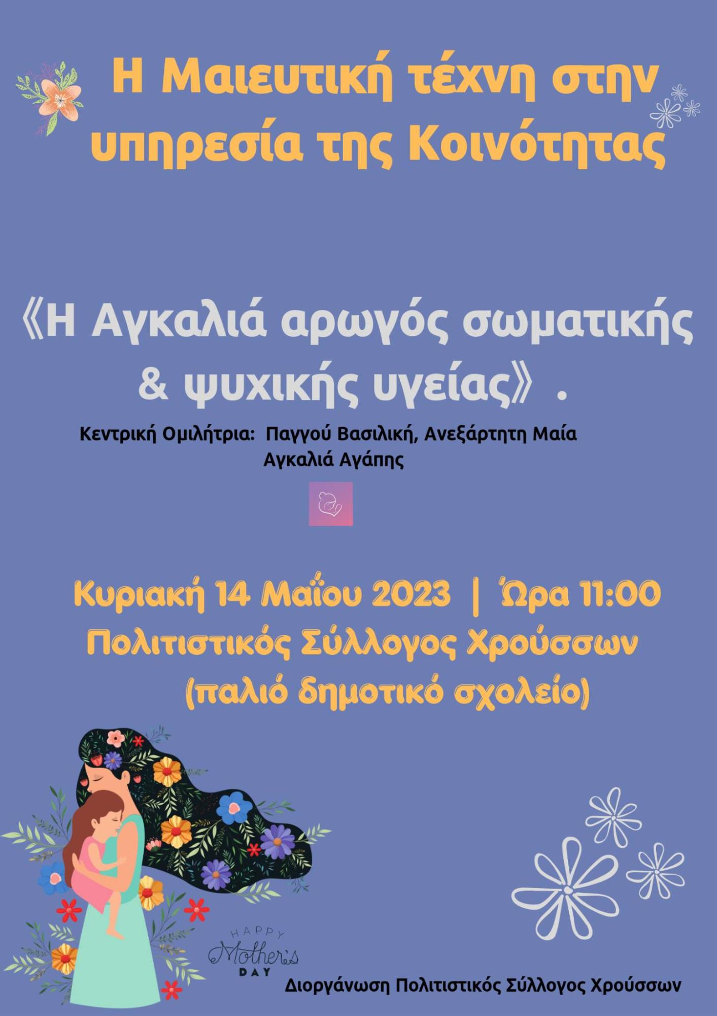 Με αφορμή την Παγκόσμια Γιορτή της Μητέρας, την Κυριακή 14 Μαΐου στις 11.00 π.μ., στο παλιό δημοτικό σχολείο των Χρούσσων, διοργανώνεται η πρώτη ανοιχτή και δωρεάν για το κοινό συνάντηση με τίτλο " Η αγκαλιά αρωγός σωματικής και ψυχικής υγείας", όπου θα συζητηθούν θέματα όπως η δύναμη της αγκαλιάς και τα άγνωστα οφέλη της, η ορμόνη της αγάπης & η ορμόνη της ευτυχίας, η αξία της αγκαλιάς στη σχέση γονέα-παιδιού, η μέθοδος Καγκουρό, η ευεργετική δράση της αγκαλιάς στους ηλικιωμένους κ.α.
