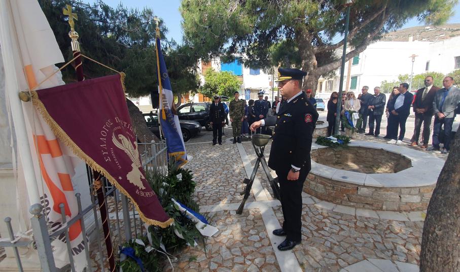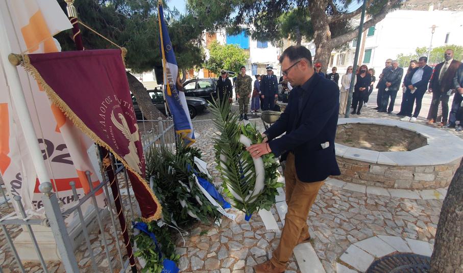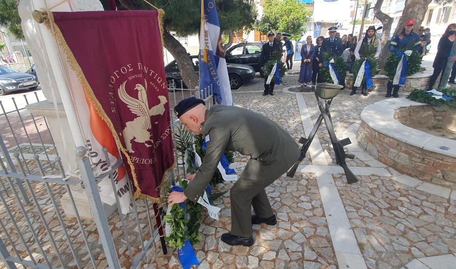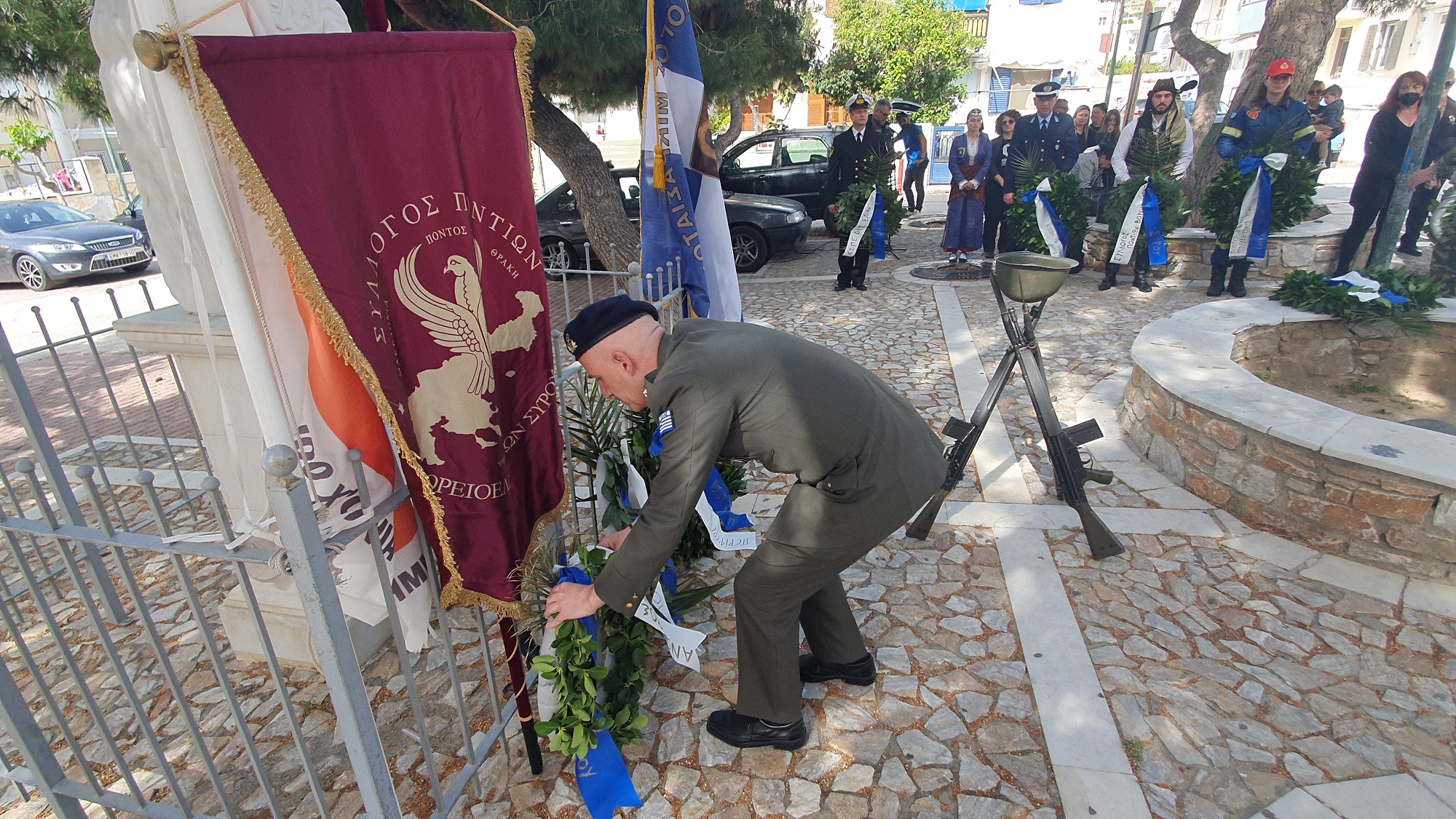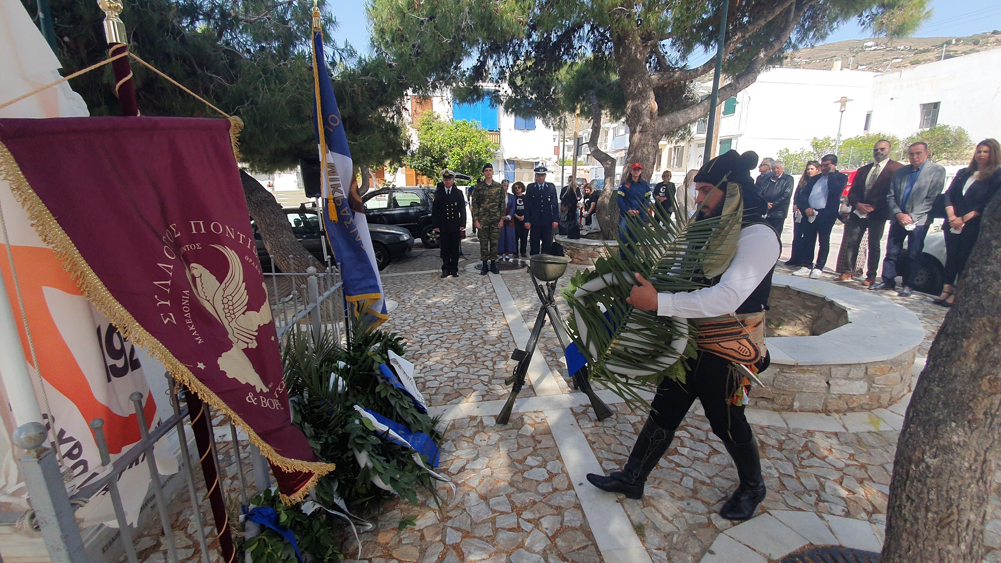 Μετά το πέρας της δοξολογίας πραγματοποίησε ομιλία, ο πρόεδρος του Συλλόγου Ποντίων και Βορειοελλαδιτών Σύρου «Ο Εύξεινος Πόντος», Νικόλαος Καρυοφυλλίδης, ο οποίος εμφανώς συγκινημένος, μεταξύ άλλων, ανέφερε πως "έχουμε δικαίωμα στην συγνώμη, δικαίωμα στην αποδοχή της αλήθειας. Η διεθνής αναγνώριση της γενοκτονίας των Ποντίων είναι αδιαπραγμάτευτη και επιβάλλεται και αποτελεί στόχο όλων μας. Θα κλείσω με μία υπόσχεση. Δεν ξεχνώ. Και με μία ευχή. Ποτέ ξανά".