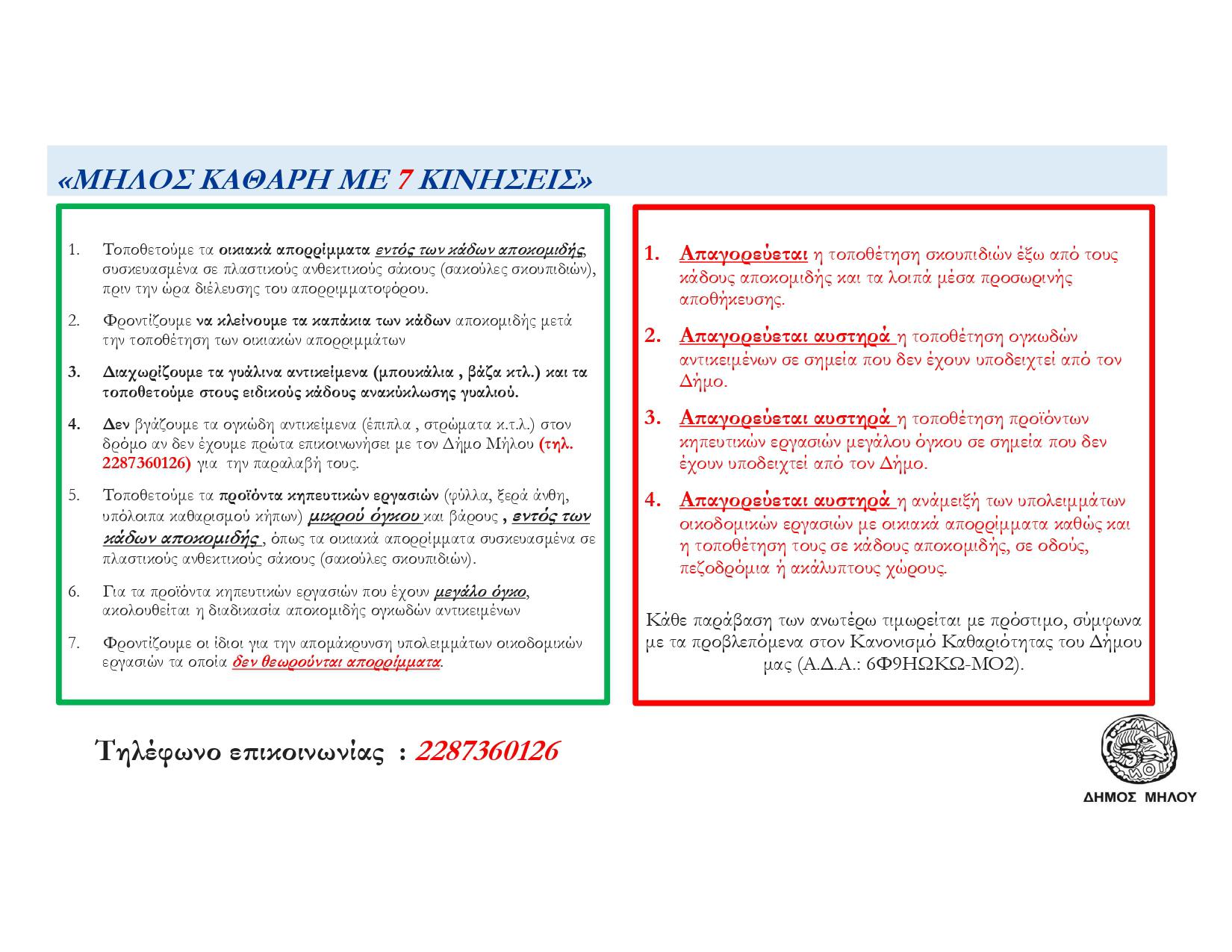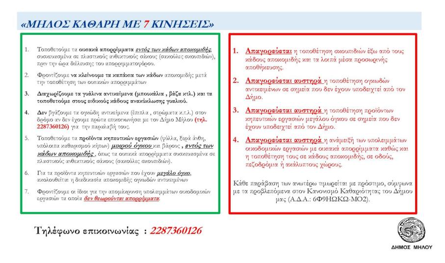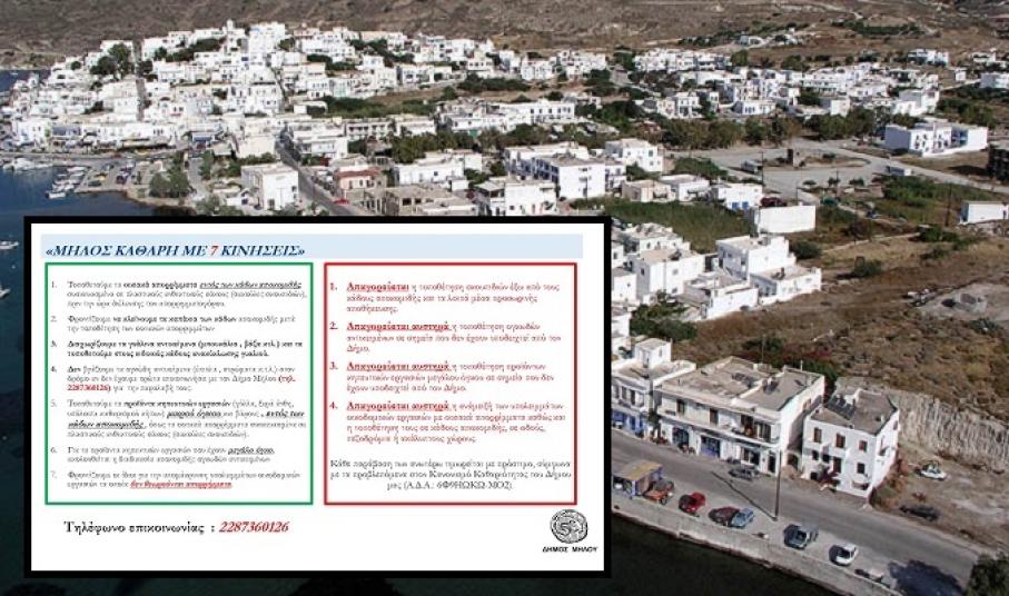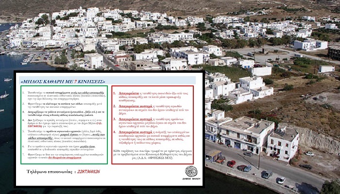 Στην ανακοίνωση του ο Δήμος αναφέρει 7 βήματα τα οποία Θα πρέπει να ακολουθούν όλοι για να προστατέψουν την Μήλο και να τη διατηρήσουν καθαρή,  όχι μόνο κατά τη διάρκεια της τουριστικής περιόδου,  αλλά για όλο το χρόνο. Οι οδηγίες, που κοινοποιήθηκαν, είναι οι εξής:
