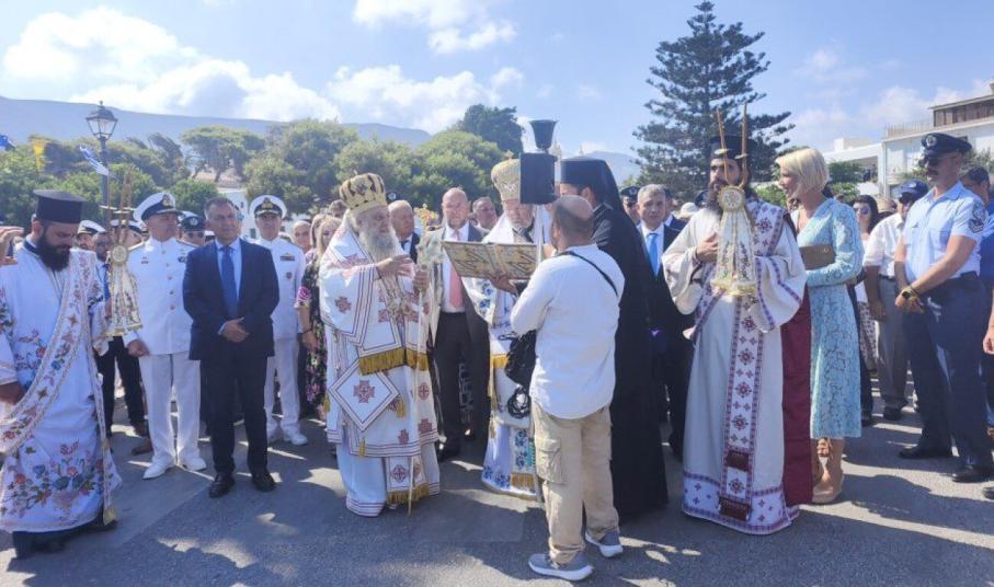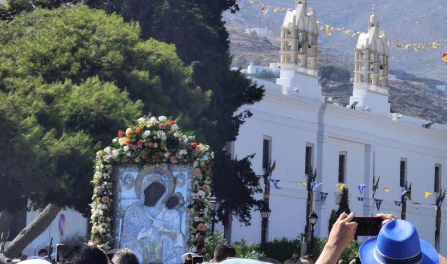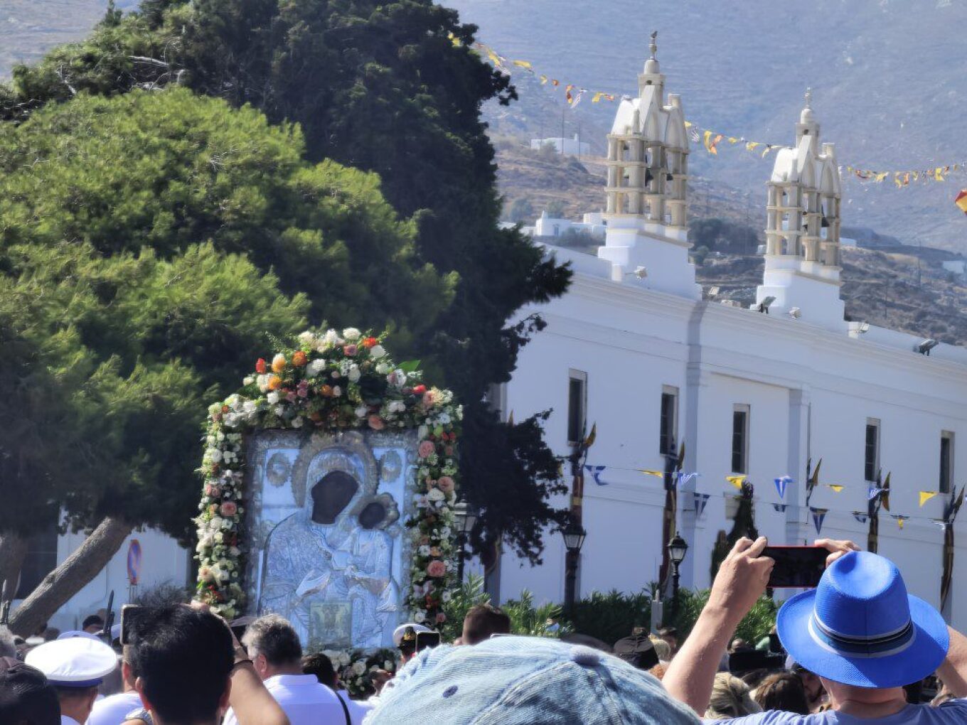 Κατόπιν, ακολούθησε η περιφορά της Ιερής Εικόνας, καθώς πιστοί και προσκυνητές συνόδευσαν με ευλάβεια την Παναγία μέχρι το λιμάνι του νησιού, όπου τα πλοία υποδέχτηκαν, με τις κόρνες τους, την Ιερά Εικόνα του νησιού.