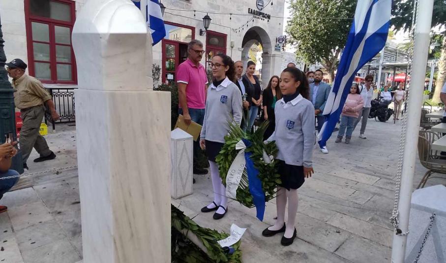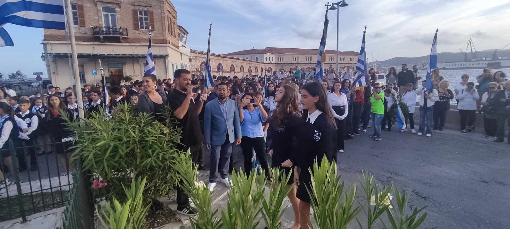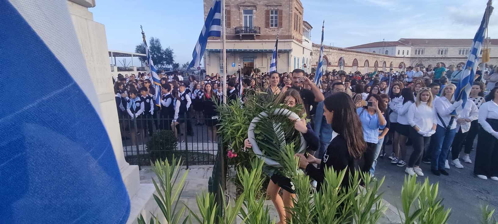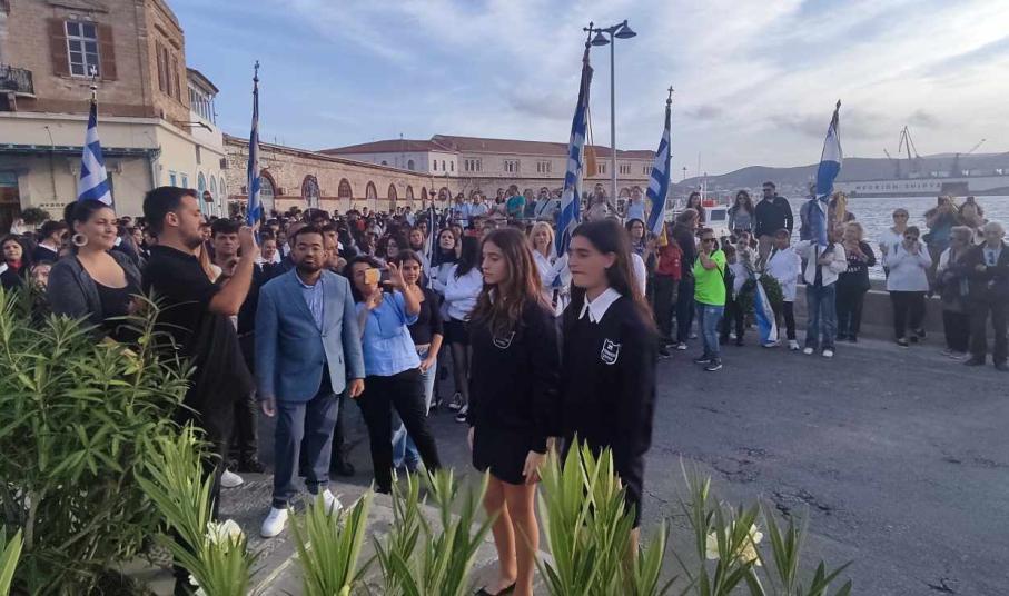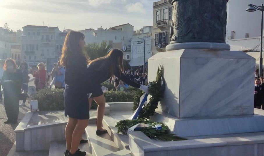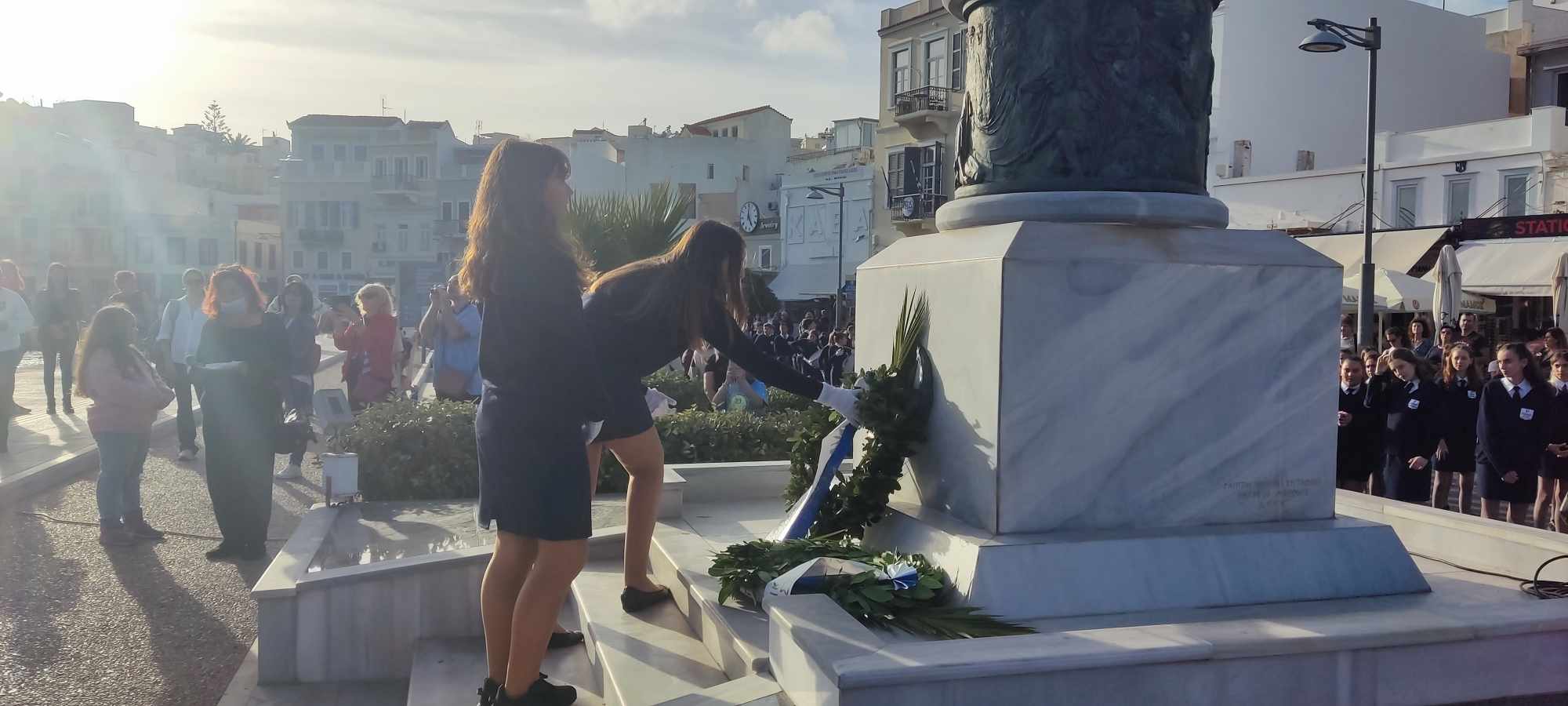 Με πλήθος κόσμου να δίνει το "παρών" πραγματοποιήθηκε με μεγαλοπρέπεια και συγκίνηση, η στεφάνωση των μνημείων στο πλαίσιο των εορτασμών για την επέτειο της 28ης Οκτωβρίου 1940. Όλοι οι παρευρισκόμενοι παρακολούθησαν, το προσκύνημα μαθητών των Σχολείων της Σύρου, σπουδαστών και προσκόπων, που προσήλθαν συντεταγμένοι με επικεφαλής τους δασκάλους, καθηγητές και βαθμοφόρους για τη κατάθεση στεφάνων.