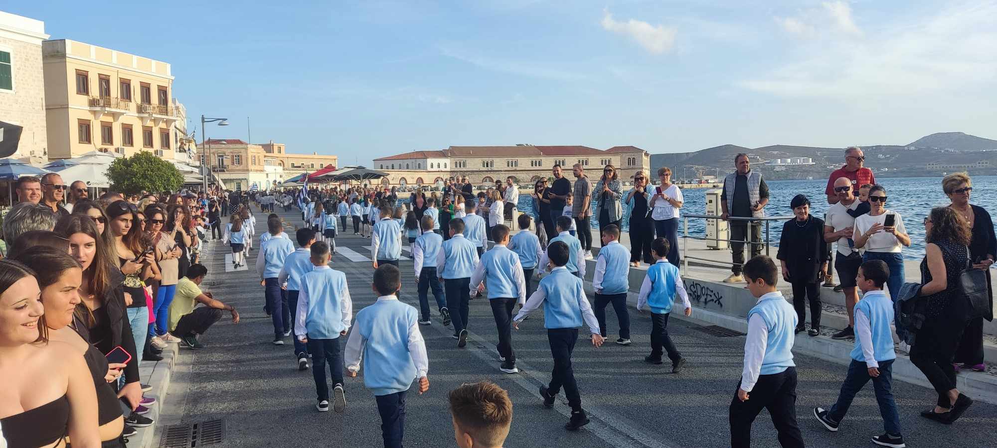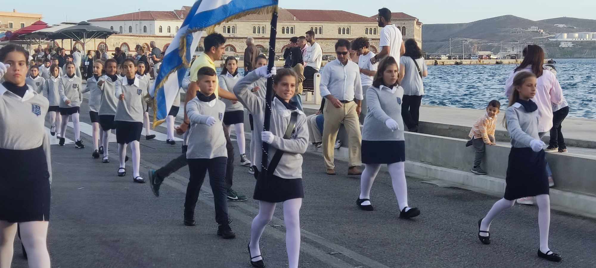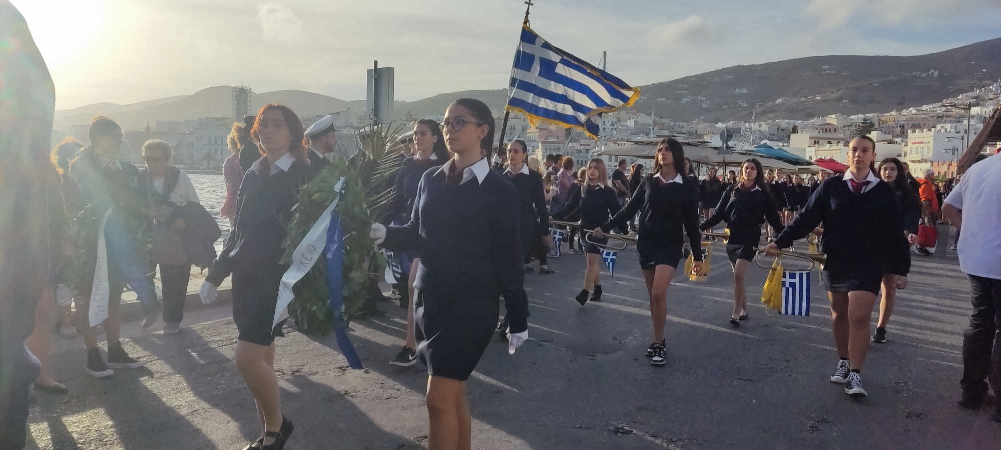Οι εορταστικές εκδηλώσεις ξεκίνησαν το πρωί στα Σχολεία Α/θμιας και Β/θμιας Εκπαίδευσης  και στην Ακαδημία Εμπορικού Ναυτικού Σύρου. Στις 11:00 πραγματοποιήθηκε επιμνημόσυνη δέηση στο Κοιμητήριο του Ι.Ν. Αγίου Γεωργίου, παρουσία Αρχών, Προϊσταμένων υπηρεσιών, αποδεκτών επισήμων προγραμμάτων και των σημαιοφόρων του 4ου και του 6ου Δημοτικού Σχολείου, του 3ου  Γυμνασίου, της Ακαδημίας Εμπορικού Ναυτικού και του Σώματος Ελλήνων Προσκόπων.