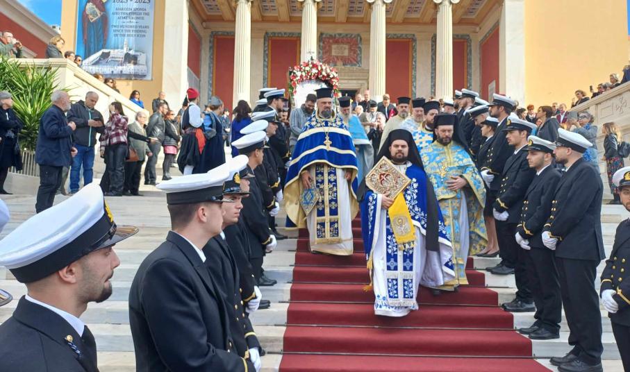 Από νωρίς το πρωί, πλήθος κόσμου συγκεντρώθηκε στον Ιερό Ναό όπου τελέστηκε η Θεία Λειτουργία, προεξάρχοντος του Σεβασμιωτάτου Μητροπολίτου Σερρών κ. Θεολόγου και συνιερουργούντων των Σεβασμιωτάτων Μητροπολιτών Νέας Ιωνίας κ.Γαβριήλ και Σύρου κ. Δωροθέου Β΄. Προ του πέραχος της Θείας Λειχουργίας θα τιμηθεί με το μεχαλλιο της Ιεράς Μηχροπόλεως ο Αξιωματικός του Ε.N. Ύπαρχος του πλοίου «BLUE STAR PAROS», κ. Σταυρος Βουδούρης, για την αυτοθυσιαστική προθυμία του να ριφθεί το παρελθόν θέρος στη θάλασσα, στο λιμάνι της Τήνου, για να σώσει ηλικιωμένη γυναίκα, που ανεβαίνονχας στο πλοίο έπεσε στη θαλασσα, από το δυνατό άνεμο.