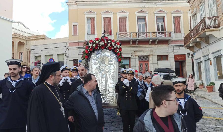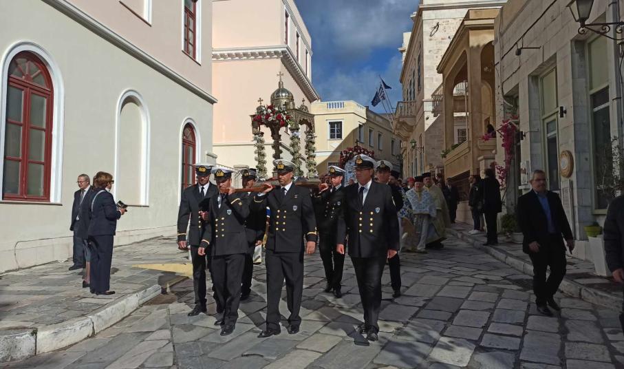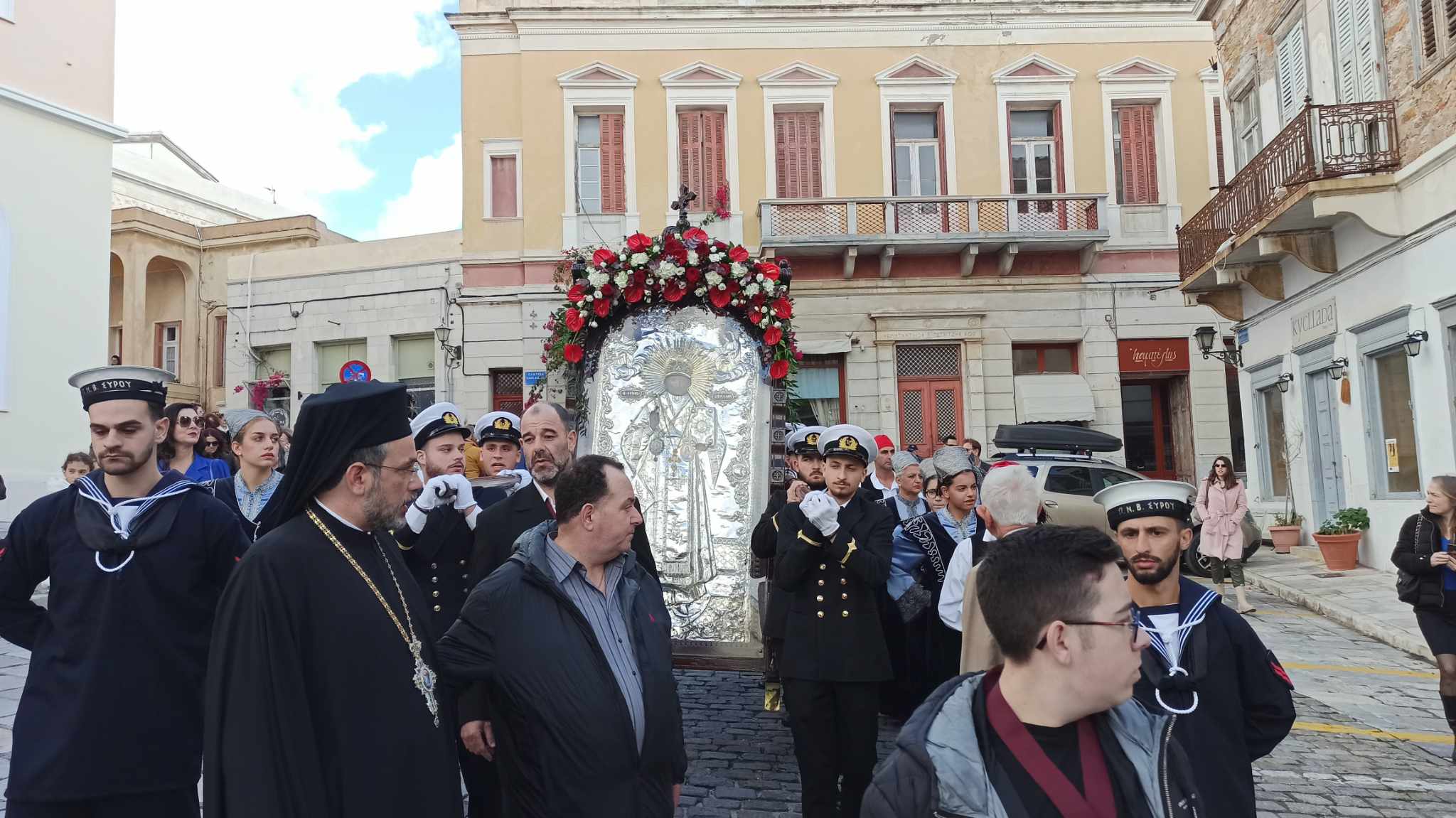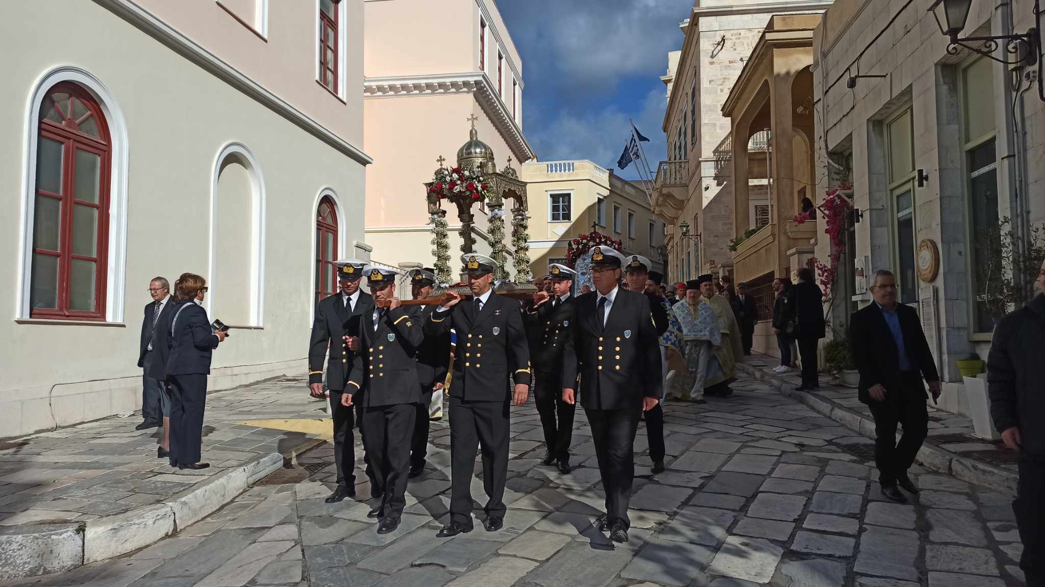 Στη συνέχει πραγματοποιήθηκε πάνδημη Λιτανεία της ιερής Εικόνας και των τιμίων Λειψάνων του Αγίου Νικολάου, με επικεφαλής τη Φιλαρμονική του Δήμου Σύρου – Ερμούπολης, με τη συμμετοχή Μελών του Λυκείου Ελληνίδων Σύρου, Σπουδαστών της Ναυτικής Ακαδημίας, Μαθητών, Προσκόπων και Αγήματος του Πολεμικού Ναυτικού, η οποία μετά τον Άγιο Νικόλαο κατευθύνθηκε στο Θέατρο Απόλλων, έπειτα στην Πλατεία Μιαούλη, όπου θα αναπεμφθεί δέηση υπέρ των ναυτιλλομένων και τέλος από την οδό Ερμού, ως την Ακτή Πέτρου Ράλλη και την Πλατεία Κανάρη, όπου έριξαν στέφανα στη θάλασσα στη μνήμη των πνιγέντων ναυτικών από τον Σεβασμιώτατο κ. Δωρόθεο Β΄, τον Εκπρόσωπο της Κυβερνήσεως, Αναπληρωτή Υπουργό Παιδείας & Αθλητισμού κ. Ιω. Βρούτση και τον Πρόεδρο των Απομάχων Ναυτικών, ενώ πλοία του Πολεμικού Ναυτικού, του Λιμενικού Σώματος, των Αλιέων, του Ναυτικού Ομίλου Σύρου και ιδιωτών θα αποδίδουν τιμές.