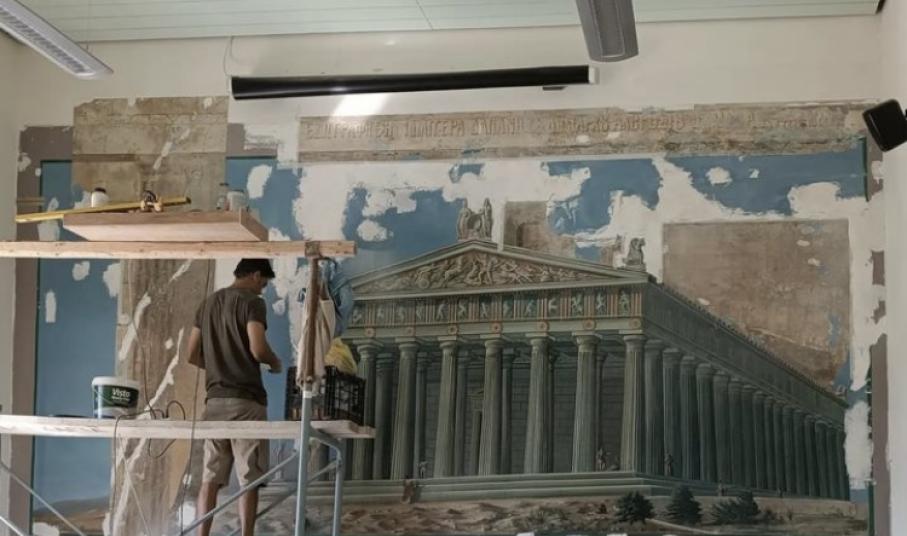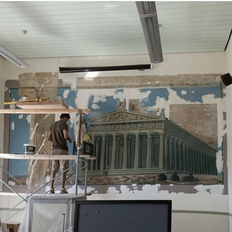 «Κάτω από τα ξεφλουδίσματα υπήρχε όμως ένας άλλος διάκοσμος, και καθώς ξύναμε ανακαλύψαμε μία φοβερή επιγραφή που έγραφε ότι ο κρυμμένος διάκοσμος έγινε επί δημαρχίας Αμβροσίου Δαμάλα το 1851, τη χρονιά που ήταν απόφοιτος ο Βολανάκης, τον οποίο κάποιες πηγές θέλουν να έχει ζωγραφήσει τον τοίχο. Μας ασκήθηκε πολλή πίεση να μην αφαιρέσουμε τον Παρθενώνα, καθώς είχε κι έντονη συναισθηματική αξία για πολύ κόσμο, ηλικιωμένους που θυμούνται τον τοίχο από την παιδική τους ηλικία, συνεπώς μπορέσαμε να διατηρήσουμε μόνο κομμάτια που αποκαλύψαμε από την κρυμμένη τοιχογραφία, μαζί με την επιγραφή».