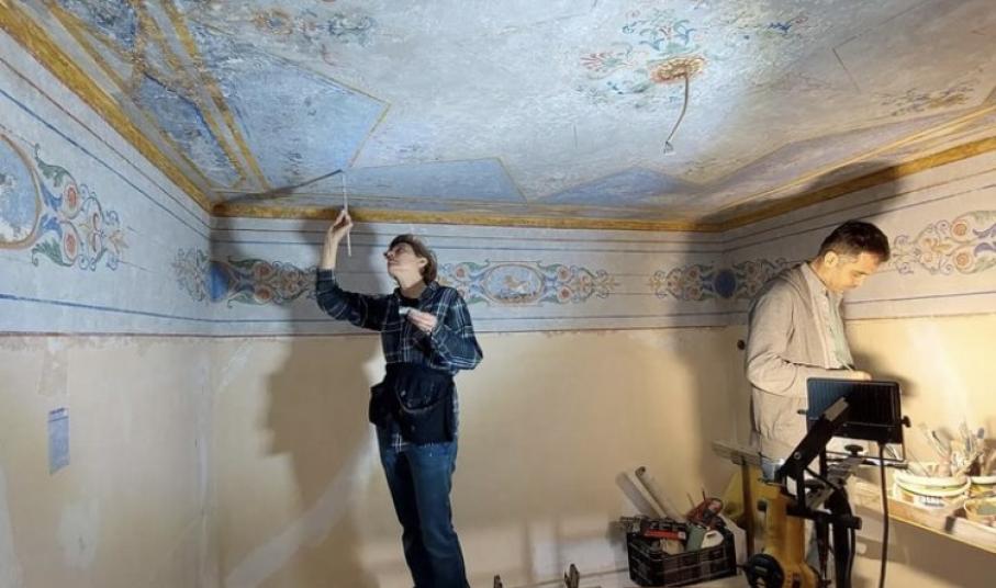 Πόσος χρόνος απαιτείται, αλήθεια, για να αποκαλυφθεί και να αποκατασταθεί μία οροφογραφία; «Όταν ξεκινήσεις αυτή τη διαδικασία, μπορεί να συναντήσεις κρεμασμένα ταβάνια, οπότε να πρέπει πρώτα να κάνεις στερεώσεις, υποστυλώσεις, συμπληρώσεις. Για δύο με τρεις περίπου εβδομάδες είμαστε “στον αέρα” και προετοιμάζουμε την οροφή», λέει η Αγγελική. «Από κει και πέρα, το ευχάριστο, πιο “καθαρό” και γοητευτικό κομμάτι της δουλειάς, η αποκατάσταση, μας παίρνει δύο εβδομάδες».