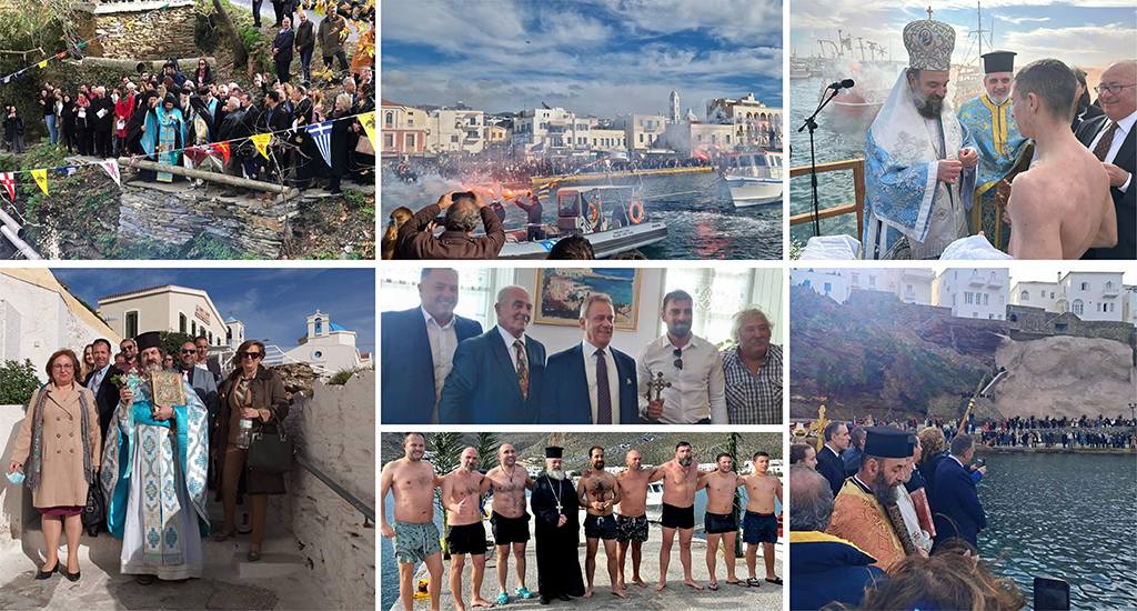 Με λαμπρότητα γιορτάστηκαν και στην Άνδρο τα Θεοφάνεια. Στην Χώρα έγινε - μετά την λειτουργία - η ρίψη τον σταυρού στη θάλασσα για τον πατροπαράδοτο αγιασμό των υδάτων στην Αγία Θαλασσινή όπου κατέβηκαν συνοδεία της Φιλαρμονικής και οι τρεις ενορίες της Χώρας. Παρόντες ο αναπληρωτής υπουργός Αθλητισμού, Γιάννης Βρούτσης, η Ολυμπιονίκης του πόλο γυναικών το 2004, Γεωργία Ελληνάκη η οποία συνόδευε τον υπουργό, καθώς και ο νέος δήμαρχος Άνδρου, Θεοδόσης Σουσούδης, η νέα έπαρχος Άνδρου, Άννα Βρεττού και πλήθος κόσμου.