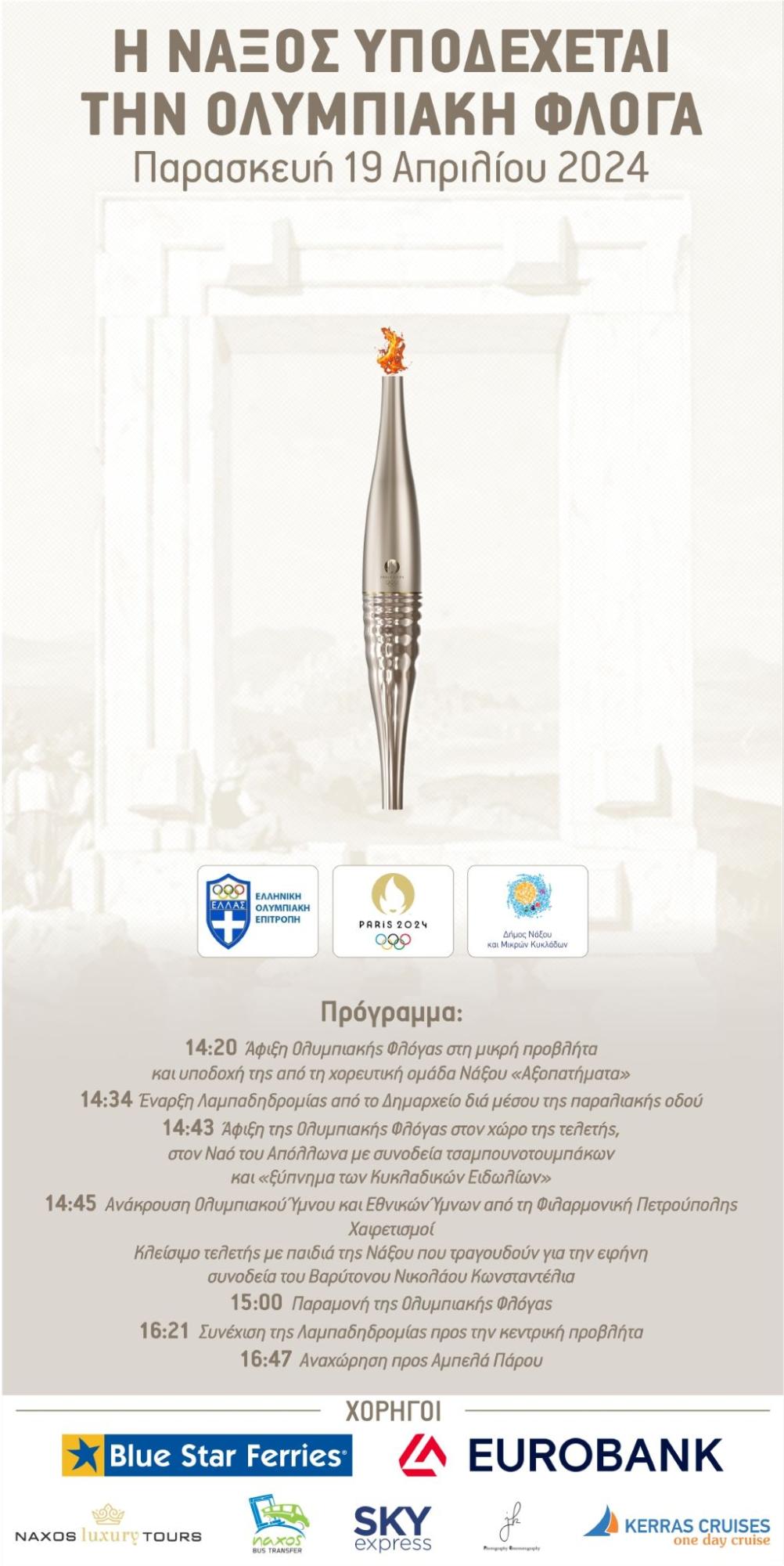 Το ταξίδι της Ολυμπιακής Φλόγας ξεκίνησε σήμερα από την Αρχαία Ολυμπία με τελικό προορισμό το Παρίσι, το οποίο φιλοξενεί εφέτος τους 33ους Ολυμπιακούς Αγώνες. Ένας από τους σταθμούς της είναι και η Νάξος, η οποία μετά από 20 χρόνια υποδέχεται ξανά το Ολύμπιο Φως, το μεσημέρι της Παρασκευής 19 Απριλίου 2024.