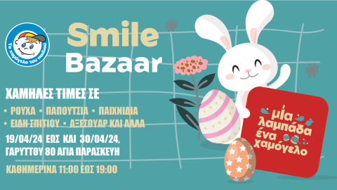 «Το Χαμόγελο του Παιδιού», με μεγάλη χαρά σας προσκαλεί στο Πασχαλινό Smile Bazaar, που όπως κάθε χρονιά τέτοια εποχή, έτσι και φέτος, διοργανώνει για να κάνετε όλες τις γιορτινές αγορές σας σε πολύ χαμηλές τιμές!