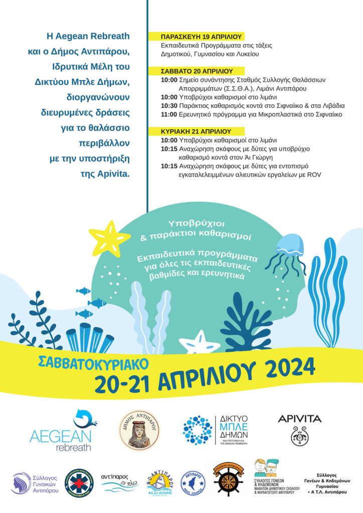 Με σκοπό ένα πιο καθαρό και υγιές θαλάσσιο περιβάλλον, ο Δήμος Αντιπάρου και η Aegean Rebreath διοργανώνουν διευρυμένες δράσεις το Σαββατοκύριακο 20-21 Απριλίου 2024, με την υποστήριξη της Apivita. Μαζί τους, θα ενισχύσουν τις δράσεις, ο Σύλλογος Εθελοντών Διασωστών Αντιπάρου-Antiparos Rescue Team, ο Ναυτικος Ομιλος Αντιπαρου ΜΕΑΣ Ωλίαρος, ο Σύλλογος Γυναικών Αντιπάρου, ο Αθλητικός Σύλλογος Πλοηγός Αντιπάρου και ο Πολιτιστικος Συλλόγος Antiparos En Plo.
