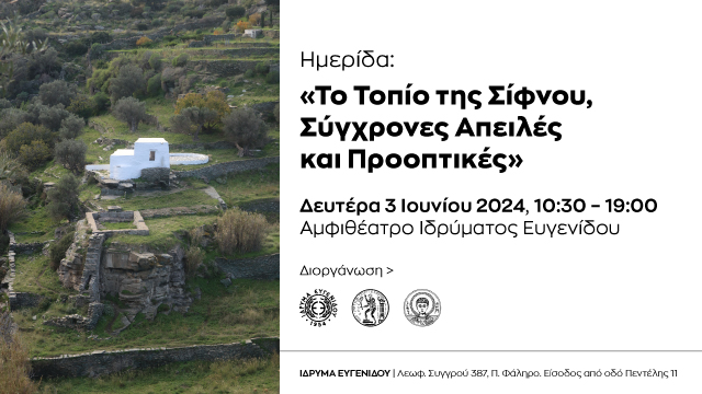 Μία σημαντική ημερίδα με θέμα: “Το Τοπίο της Σίφνου, Σύγχρονες Απειλές και Προοπτικές”, συνδιοργανώνει το Ίδρυμα Ευγενίδου, με τη Σχολή Αρχιτεκτόνων Μηχανικών του Εθνικού Μετσόβιου Πολυτεχνείου (Ε.Μ.Π.) και το Τμήμα Αρχιτεκτόνων Μηχανικών του Αριστοτελείου Πανεπιστημίου Θεσσαλονίκης (Α.Π.Θ.), τη Δευτέρα 3 Ιουνίου 2024 και ώρα 10:30 -18:00, στο Αμφιθέατρου του ιδρύματος Ευγενίδου.