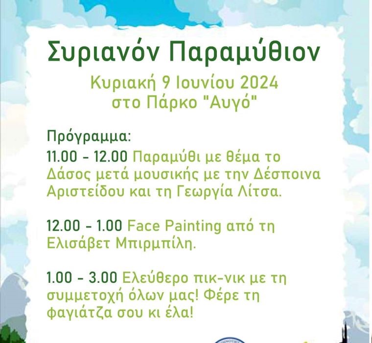 Η Κοινότητα Ερμούπολης σε συνεργασία με την αντίστοιχη του Μάννα, διοργανώνει την Κυριακή 9 Ιουνίου στις 11 το πρωί, στο πάρκο "Αυγό" το "Συριανόν Παραμύθιον".