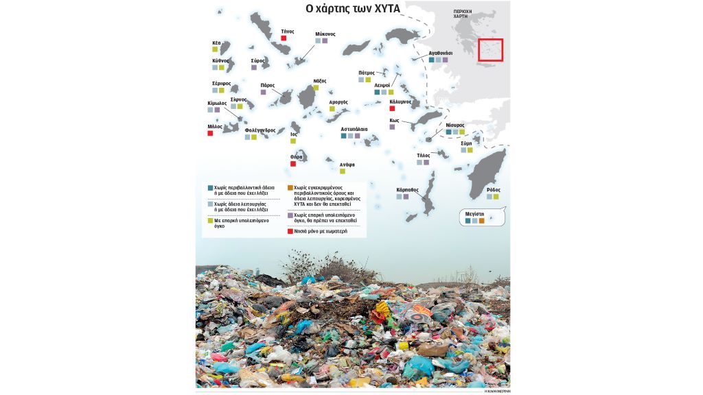 • Επτά νησιά εξακολουθούν να θάβουν σκουπίδια σε παράνομες χωματερές (Δήμοι Θήρας, Μήλου, Καλυμνίων, Σύμης, Μυκόνου, Τήνου και Φολεγάνδρου), για τις οποίες η χώρα καταβάλλει πρόστιμο. Και τέσσερα νησιά που δεν διαθέτουν ΧΥΤΑ (Ανδρος, Τήνος, Μήλος, Λέρος) «δεματοποιούν» τα σκουπίδια ως «μεταβατική» λύση μέχρι την κατασκευή υποδομής. Μάλιστα, βάσει του ισχύοντος περιφερειακού σχεδιασμού, η Θηρασιά και η Σίκινος μεταφέρουν τα σκουπίδια τους στη Σαντορίνη και την Ιο όπου υπάρχει μόνο χωματερή. Ενώ, η Ψέριμος και η Τέλενδος μεταφέρουν τα σκουπίδια τους στην Κάλυμνο προς δεματοποίηση.