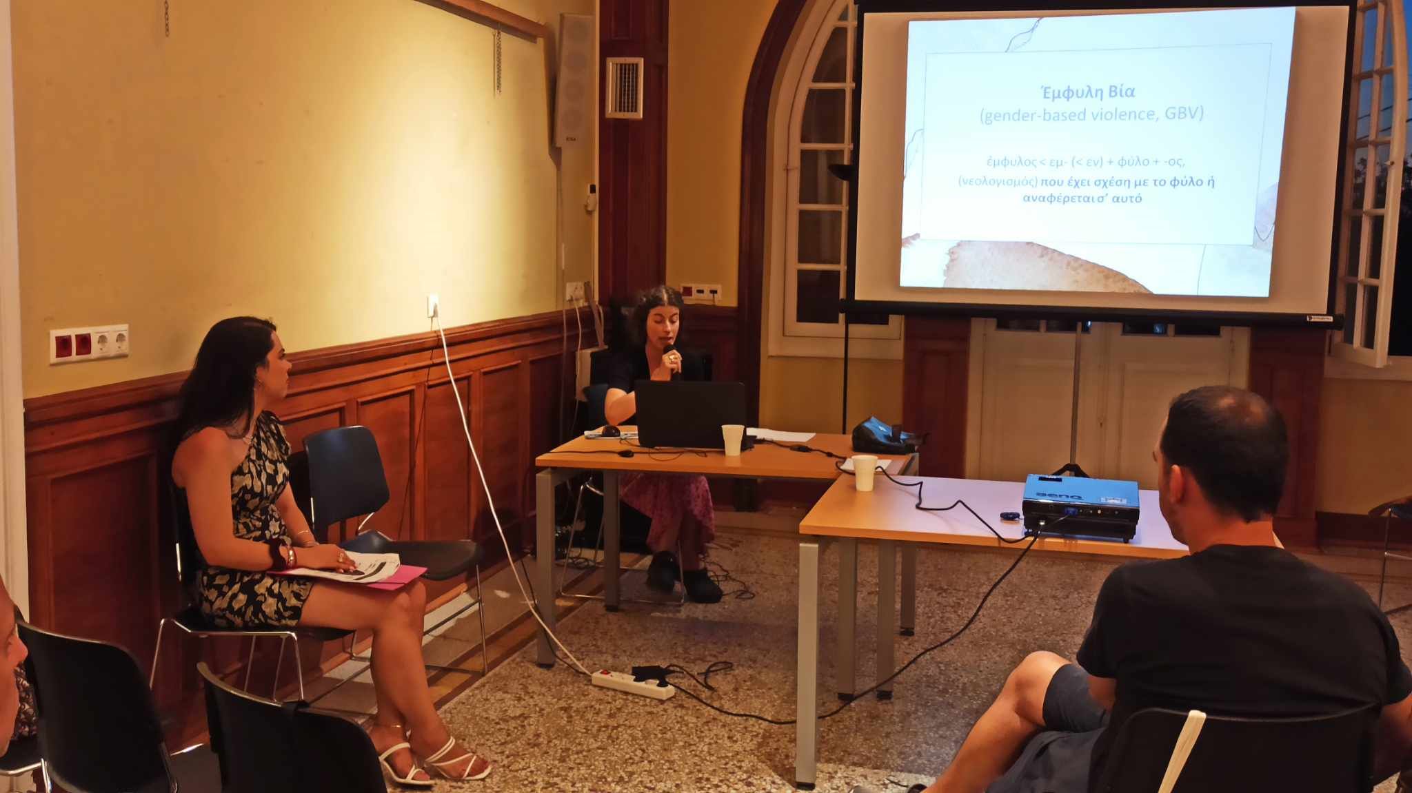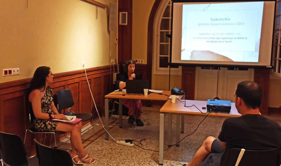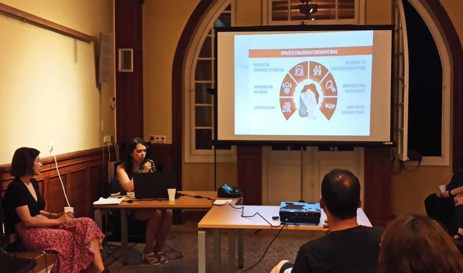 "Η έμφυλη βία δεν είναι μόνο η σωματική, καθώς αυτή μπορούμε να τη συναντήσουμε σε πολλές μορφές, όπως είναι η ψυχολογική ή και η λεκτική, η οικονομική, η κοινωνική, η σωματική, αλλά και η σεξουαλική", τόνισε απευθυνόμενη προς το κοινό η κα. Μακρίδου, επικεντρώνοντας στη συνέχεια στη βία που εντοπίζονται μέσα στην οικογένεια, τη λεγόμενη ενδοοικογενειακή βία.