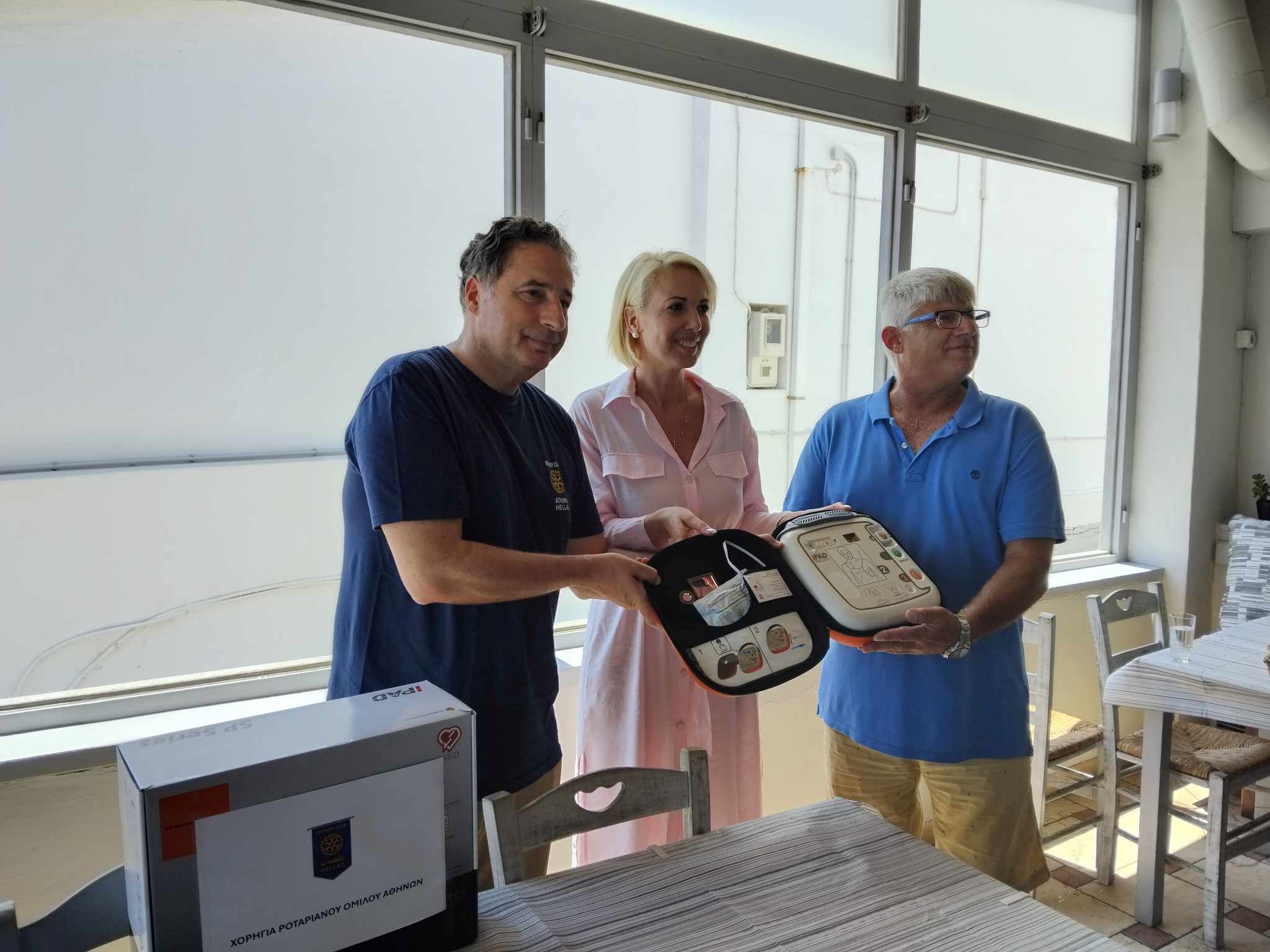 Ο αυτόματος απινιδωτής που σκοπό έχει την κάλυψη τυχόν περιπτώσεων έκτακτης ανάγκης της περιοχής και που εγκαταστάθηκε στον εξωτερικό χώρο του καταστήματος εστίασης "Ο Κοντός στου Ραφογιάννη", αποτελεί μία προσφορά του Ροταριανού Ομίλου Αθήνας.
