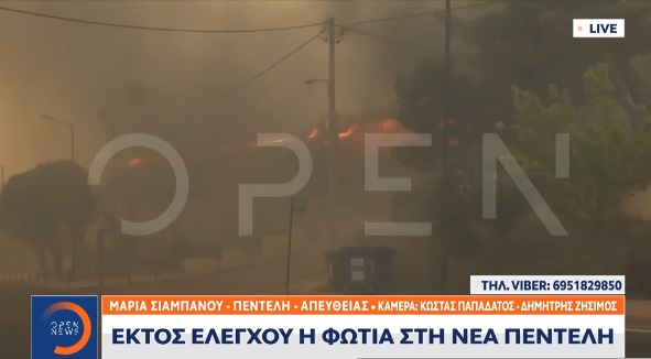 Δραματικές είναι οι εικόνες από την πύρινη λαίλαπα, που παραμένει εκτός ελέγχου στην Αττική. Απόκοσμο είναι το τοπίο στη Νέα Πεντέλη, όπου πριν από λίγο οι φλόγες έζωσαν το σχολείο της περιοχής το οποίο καταστρέφεται.