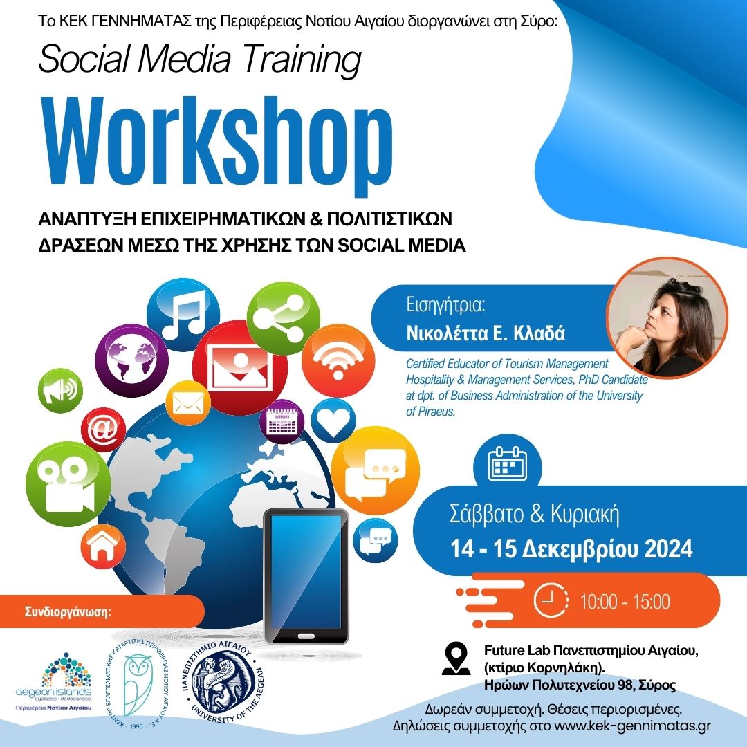 "Σε συνεργασία με το Πανεπιστήμιο Αιγαίου και την Περιφέρεια Νοτίου Αιγαίου, το ΚΕΚ "Γεννηματάς" διοργανώνει στη Σύρο, το ερχόμενο Σαββατοκύριακο 14 και 15 Δεκεμβρίου, διήμερο σεμινάριο με θέμα "Ανάπτυξη Επιχειρηματικών και Πολιτιστικών Δράσεων μέσω της χρήσης των Social Megia". Σκοπός του σεμιναρίου είναι να παρέχει στους συμμετέχοντες τις γνώσεις και τα εργαλεία που χρειάζονται για να αναπτύξουν επιχειρηματικές και πολιτιστικές δράσεις μέσω της στρατηγικής χρήσης των social media. Οι συμμετέχοντες θα μάθουν πώς να αξιοποιούν τις πλατφόρμες κοινωνικής δικτύωσης για να αυξήσουν την προβολή, να ενισχύσουν την αλληλεπίδραση με το κοινό τους και να επιτύχουν τους στόχους τους σε επιχειρηματικό και πολιτιστικό επίπεδο. Το σεμινάριο θα πραγματοποιηθεί και τις δυο μέρες από τις 10 π.μ. έως τις 3 μ.μ. στο future lab του Πανεπιστημίου Αιγαίου στο κτήριο Kορνηλάκη, Ηρώων Πολυτεχνείου 98, στην Ερμούπολη. Η συμμετοχή είναι δωρεάν και ο αριθμός των συμμετεχόντων περιορισμένος. Από την πληροφόρηση που έχω, νομίζω πως υπάρχουν ακόμα κάποιες λίγες θέσεις για όσους δεν έχουν προλάβει να δηλώσουν συμμετοχή στο https://kek-gennimatas.gr/".