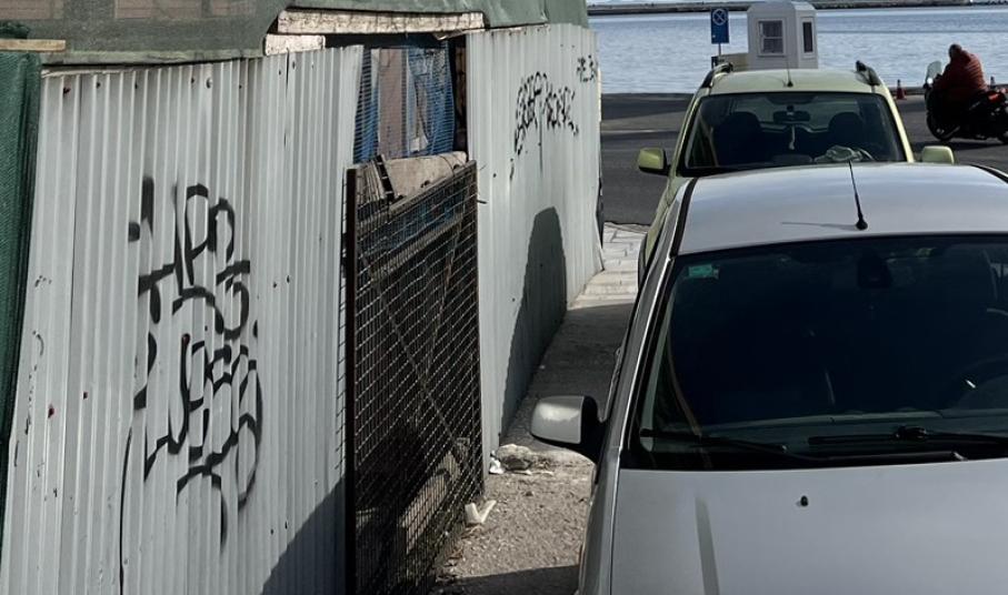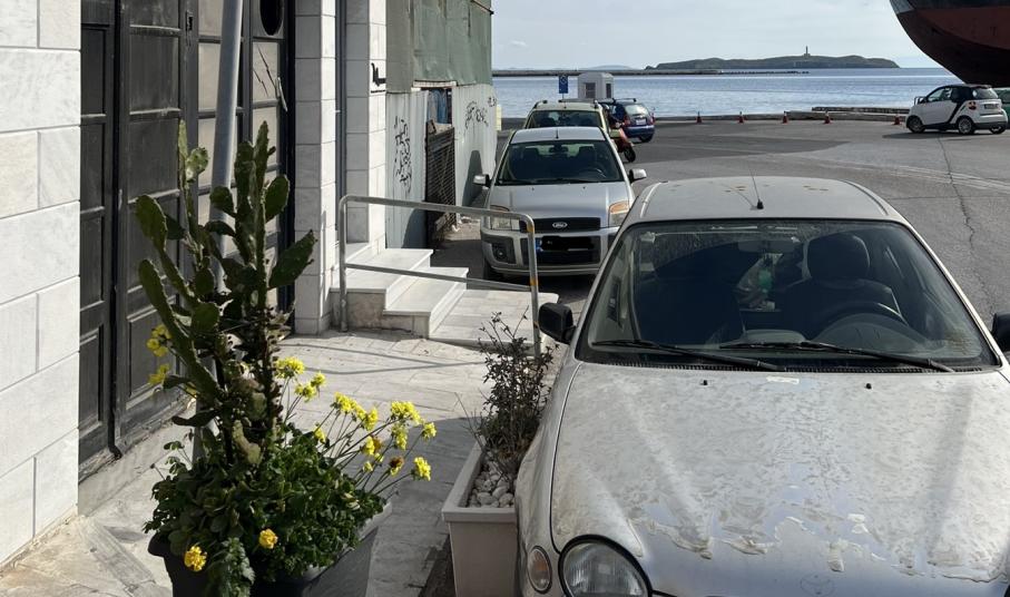 Μία πολύ δυσάρεστη εικόνα αντιμετωπίζουν καθημερινά όσοι πεζοί προσπαθούν να διασχίσουν το πεζοδρόμιο που περνάει μπροστά από το κτήριο της παλιάς Πυροσβεστικής στο λιμάνι της Ερμούπολης.