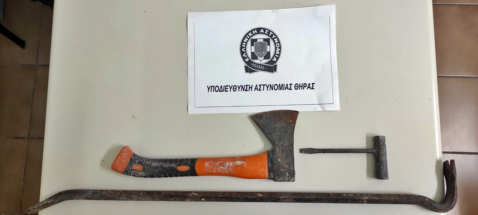 Κατά τον εντοπισμό του, βρέθηκαν στην κατοχή του ως διαρρηκτικά εργαλεία και κατασχέθηκαν τσεκούρι, κατσαβίδι και μεταλλική ράβδος (σκύλα).
