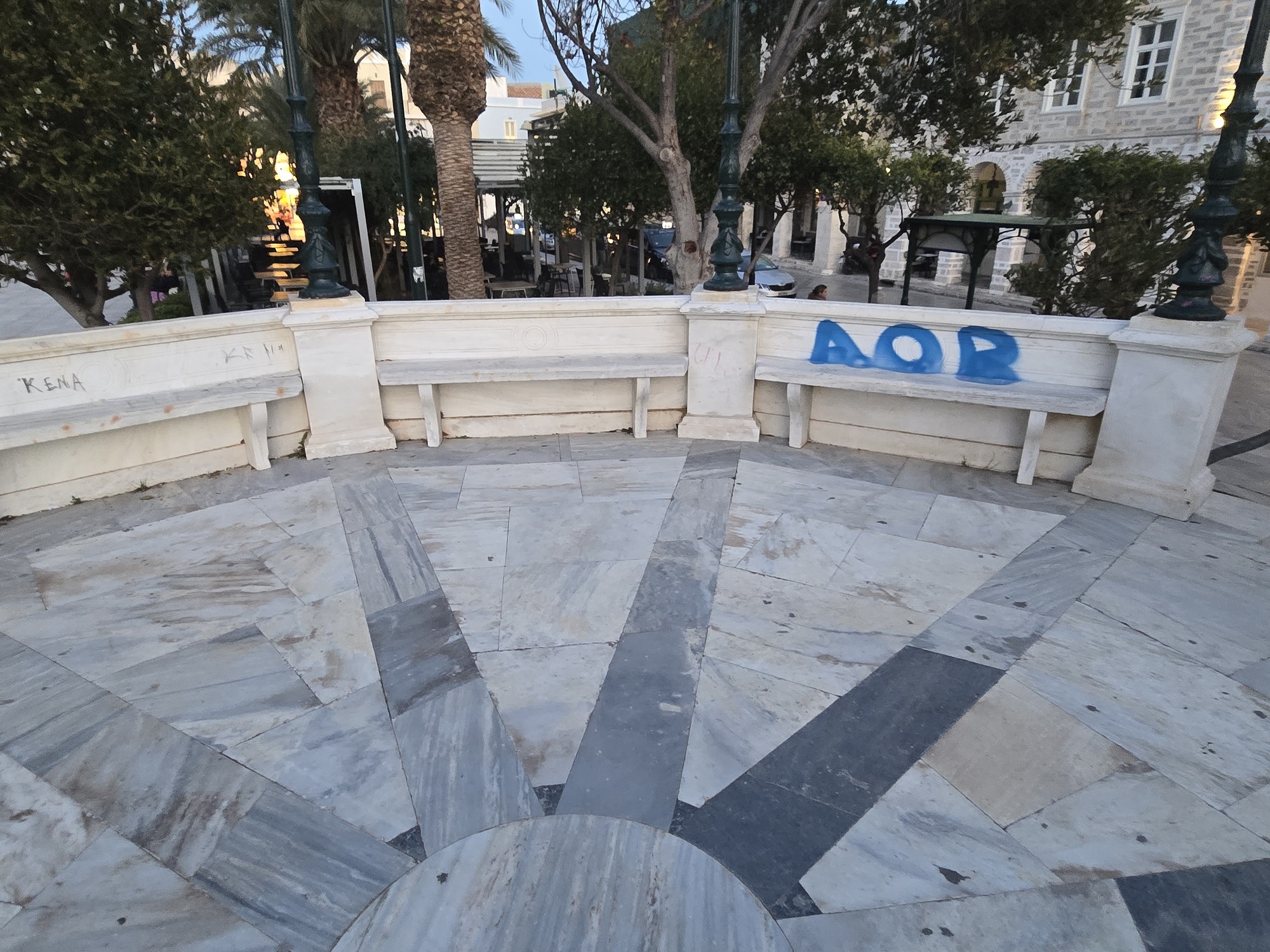 Από αυτή την άσχημη "μόδα", δεν μπόρεσε να γλιτώσει ούτε η ιστορική μαρμάρινη εξέδρα, έργο του γλύπτη Ιωάννη Βιτάλη, με χορηγία του μεγαλέμπορου Θεόδωρου Πάγκαλου (1833 – 1915), που βρίσκεται πλησίον του αγάλματος του Μιαούλη στην κεντρική πλατεία του νησιού, ακριβώς απέναντι από το Δημαρχείο.