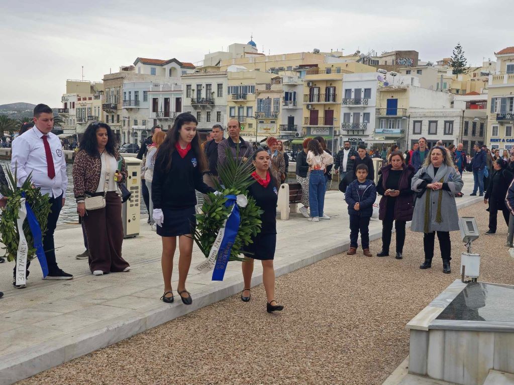 Αμέσως μετά έγινε κατάθεση στεφάνων στο ηρώο των πεσόντων από τον χωρικό αντιπεριφερειάρχη Κυκλάδων, Γιώργο Λεονταρίτη, τους μαθητές του 4ου Πειραματικού Δημοτικού Σχολείου Ερμούπολης, του 5ου Δημοτικού Σχολείου Ερμούπολης, του Βαμβακάρειου Λυκείου των Εκπαιδευτηρίων "ΔΕΛΑΣΑΛ" Σύρου, του Πρότυπου ΕΠΑΛ Σύρου, του Εσπερινού ΕΠΑΛ Σύρου, του Ενιαίου Ειδικού Επαγγελματικού Γυμνασίου - Λυκείου Σύρου και τους σπουδαστές και τις σπουδάστριες του Δημόσιου Ινστιτούτου Επαγγελματικής Κατάρτισης (ΔΙΕΚ) του Γενικού Νοσοκομείου Σύρου.