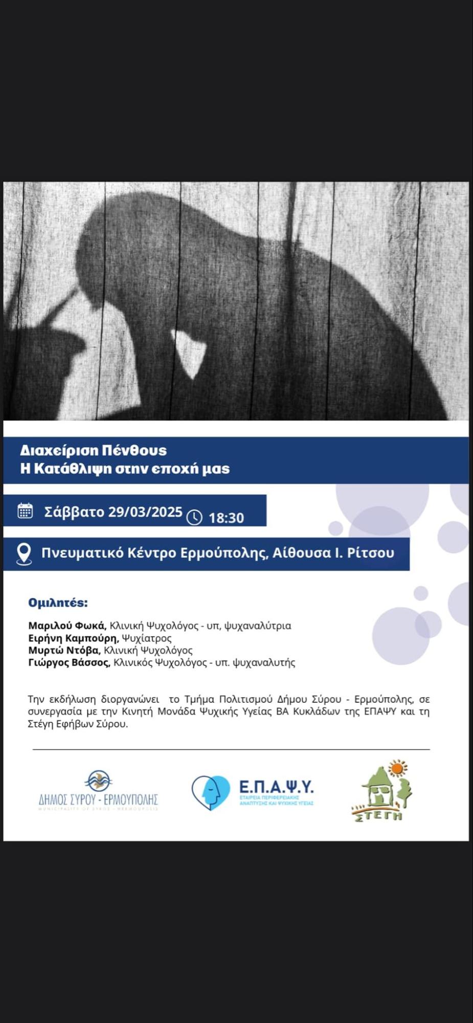 Με κεντρικό στόχο την ευαισθητοποίηση και η ενημέρωση του κοινού, καθώς και η παροχή χρήσιμων πληροφοριών για την κατανόηση, την πρόληψη και τη διαχείριση αυτών των καταστάσεων, διοργανώνεται αύριο, Σάββατο στις 6 και μισή το απόγευμα στη Σύρο, ομιλία με θέμα την κατάθλιψη και τη διαχείριση του πένθους.