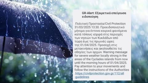 Σύμφωνα με το μήνυμα, προβλέπονται έντονα καιρικά κατά τόπους ισχυρά φαινόμενα στις περιοχές των νησιών των Κυκλάδων από τώρα και ως τις πρωινές ώρες της 1ης Απριλίου 2025