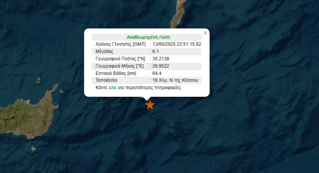Καθησυχαστικοί εμφανίζονται οι επιστήμονες για την ισχυρή σεισμική δόνηση μεγέθους 6,1 βαθμών της κλίμακας Ρίχτερ που σημειώθηκε στα ανοιχτά της Κάσου. Το επίκεντρο του σεισμού εντοπίστηκε 20 χιλιόμετρα Νότια της Κάσου και είχε εστιακό βάθος 64,4 χλμ. Ο σεισμός έγινε ιδιαίτερα αισθητός στην Κρήτη και στη Ρόδο ενώ εκδόθηκε προληπτικά προειδοποίηση για τσουνάμι.