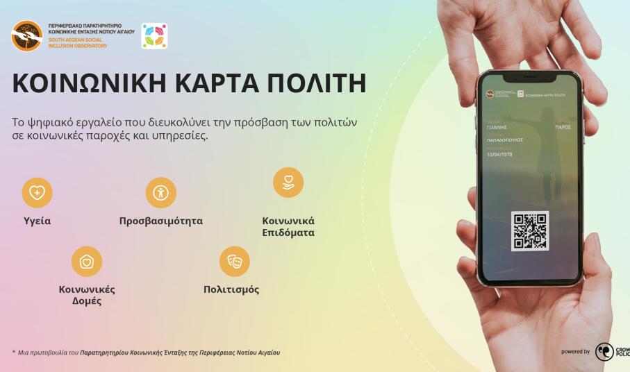 Με την Κοινωνική Κάρτα Πολίτη, ένας πολίτης ή επισκέπτης της Περιφέρειας Νοτίου Αιγαίου αφού κάνει εγγραφή, στη συνέχεια μπορεί να αντλήσει πληροφορίες, εύκολα και γρήγορα από το κινητό ή τον υπολογιστή του, για δομές υγείας της περιοχής όπου βρίσκεται, για προσβάσιμους πολιτιστικούς χώρους και υποδομές, για βασικά κοινωνικά επιδόματα, δομές κοινωνικής προστασίας και πολιτιστικά δρώμενα.